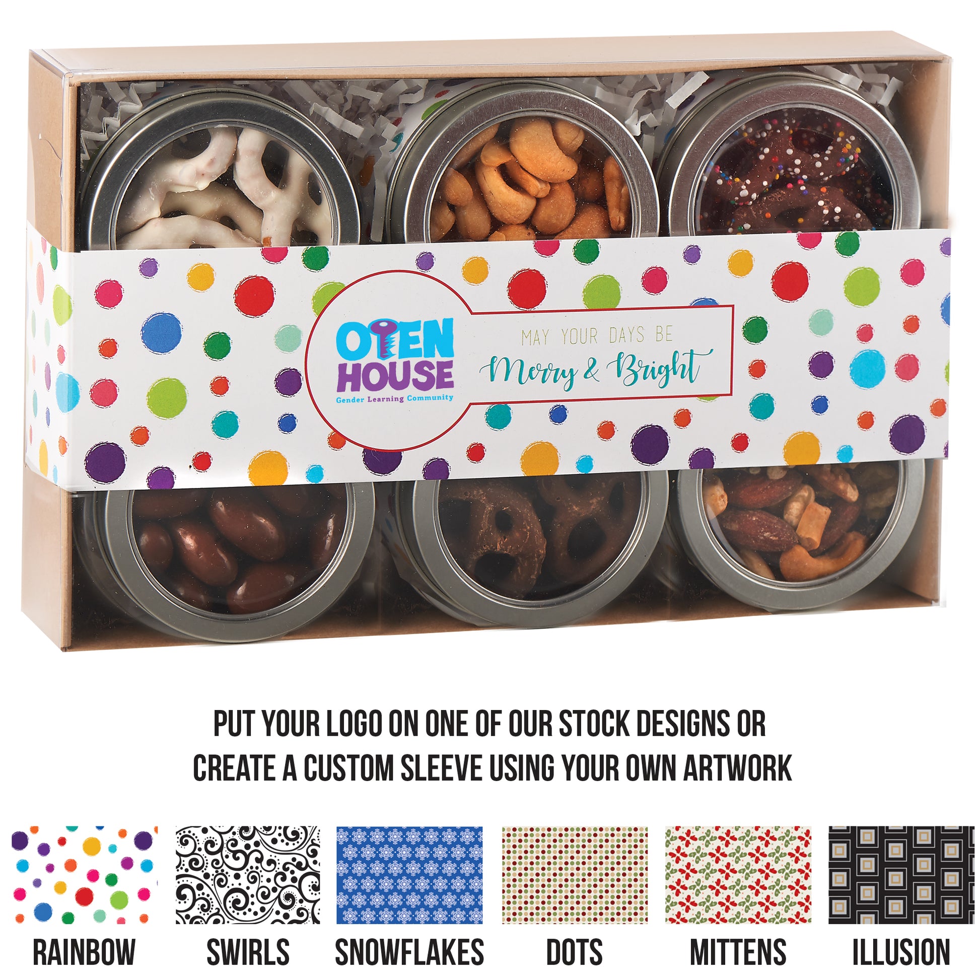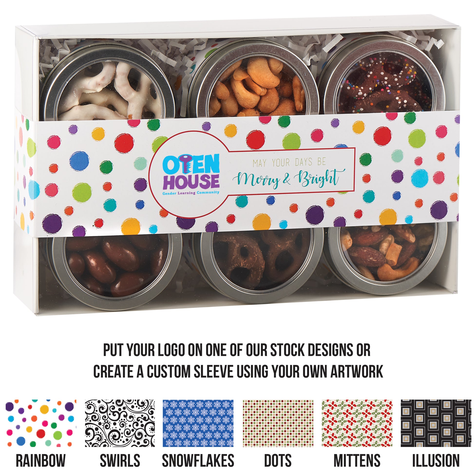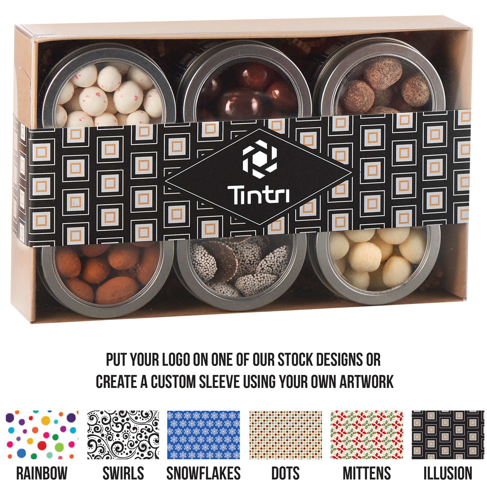 Our 6 Way Gift Tin Set is a sophisticated sampler of gourmet flavors, featuring six individual tins filled with your choice of chocolate and nut combinations. The clear windowed box highlights the variety inside, while a full-color custom sleeve puts your logo or artwork front and center for maximum brand impact. Perfect for holiday gifting, corporate events, or client appreciation, this versatile set combines elegance, variety, and flavor in one unforgettable package.