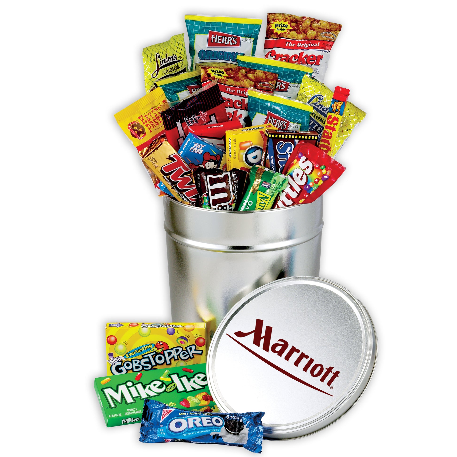 Our 3.5 Gallon Tin is a versatile gift that’s as impressive as it is customizable. Each 3.5 tin is filled with 6 Bags of Popcorn and Snacks, 4 Bags of Assorted Cookies and 16 Assorted Movie Theatre Size Candies. Each tin comes standard with a bold 1-color direct imprint on the lid, but you can also upgrade to full-color printing and add custom artwork to the body for maximum impact. Perfect for corporate gifting, events, or personal celebrations, this generous tin delivers both flavor and style.