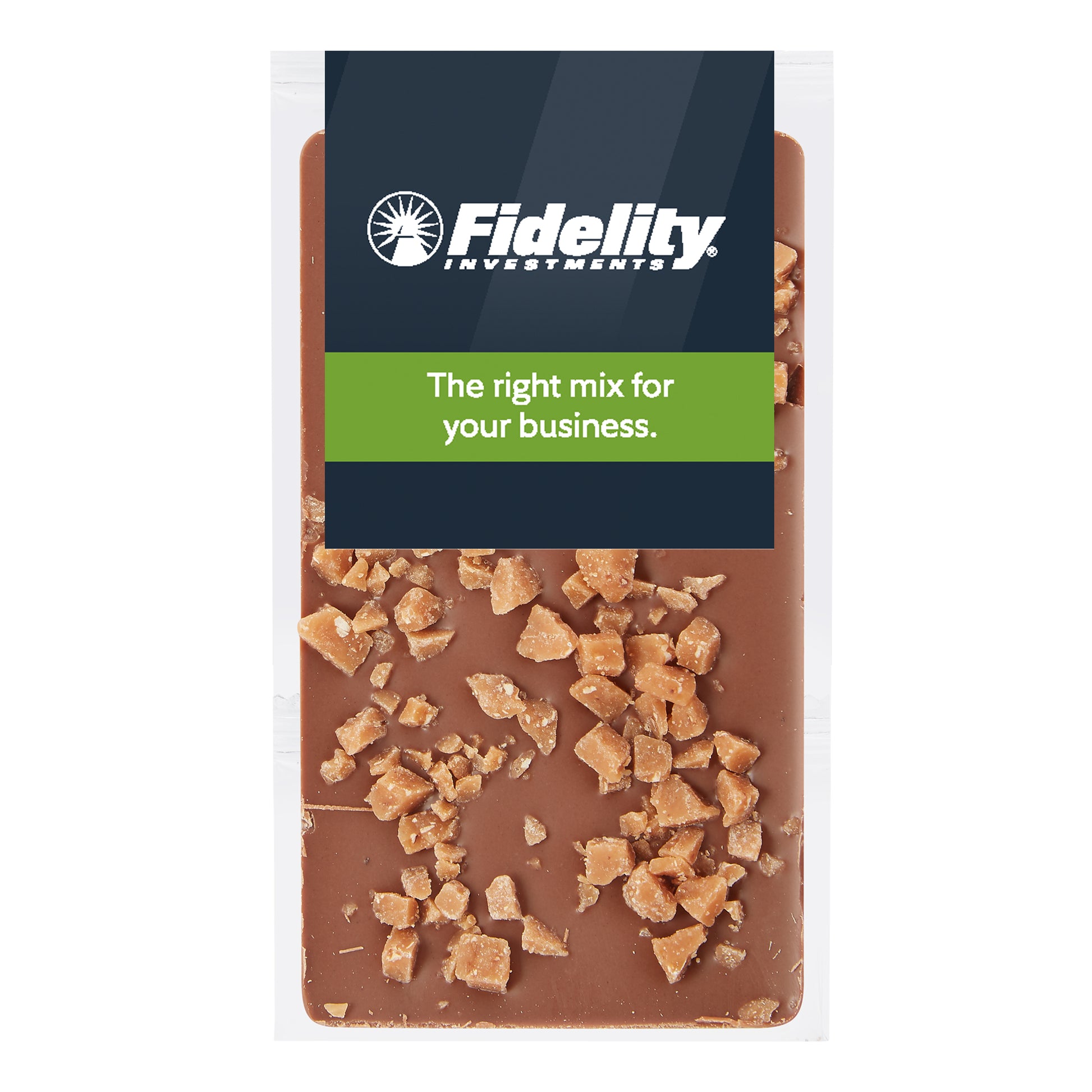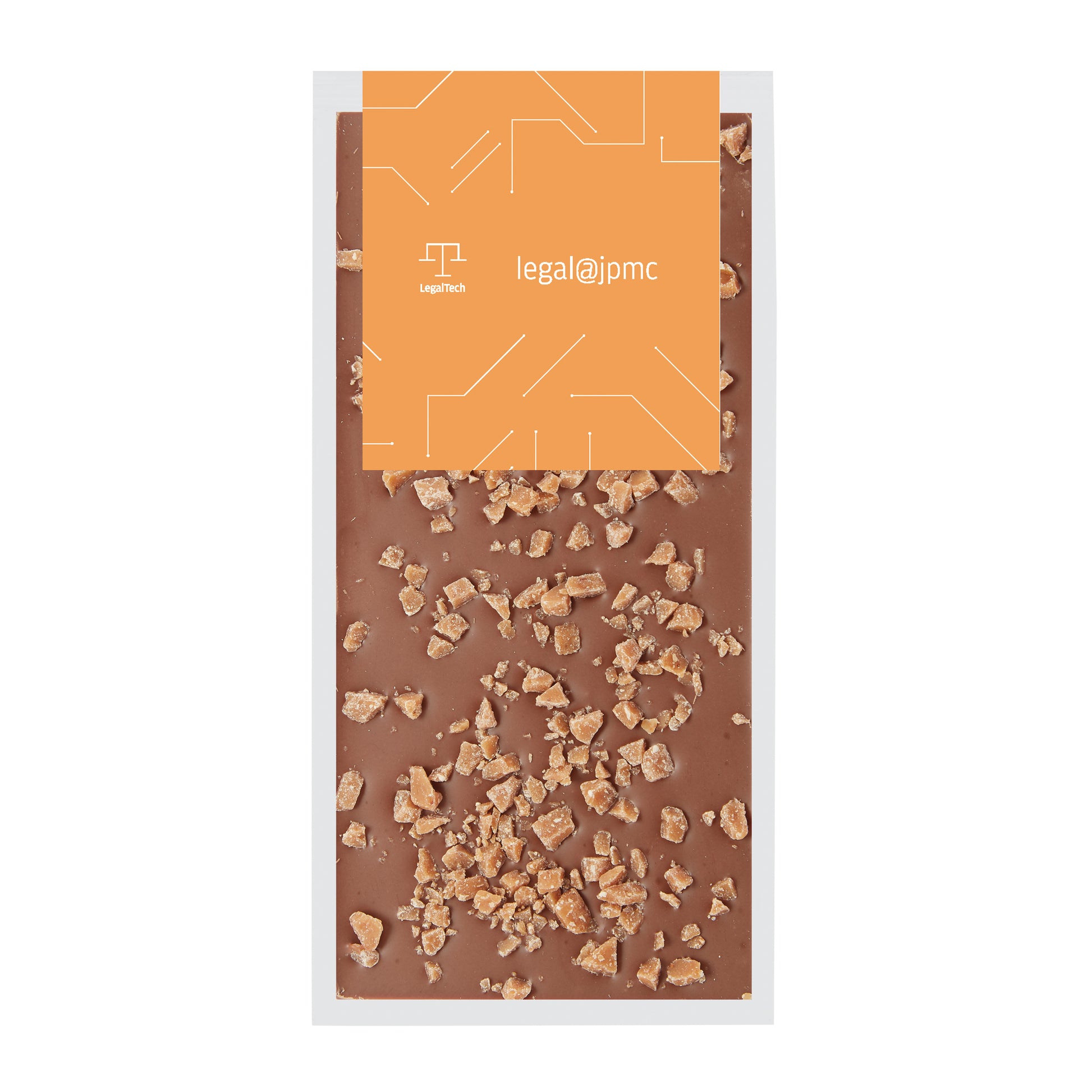 Indulge in a moment of refined delight with our Belgian Chocolate Bar, elegantly garnished with decadent toppings, including crushed oreos, toffee bits, and even Corporate Color™ nonpareil sprinkles to reflect your brand or theme. A custom full color label dresses up this bar.