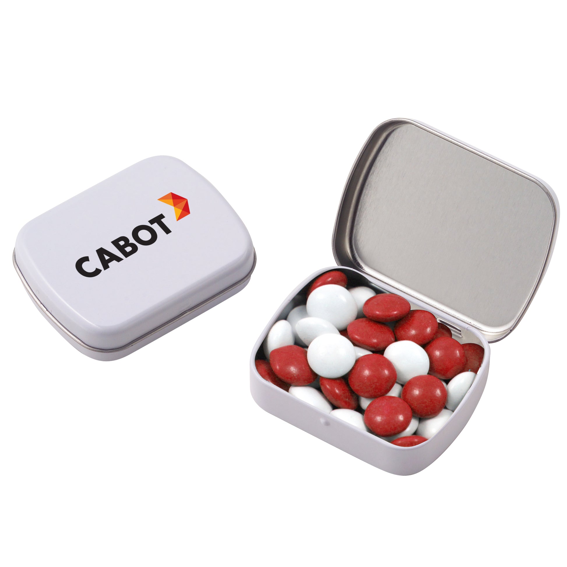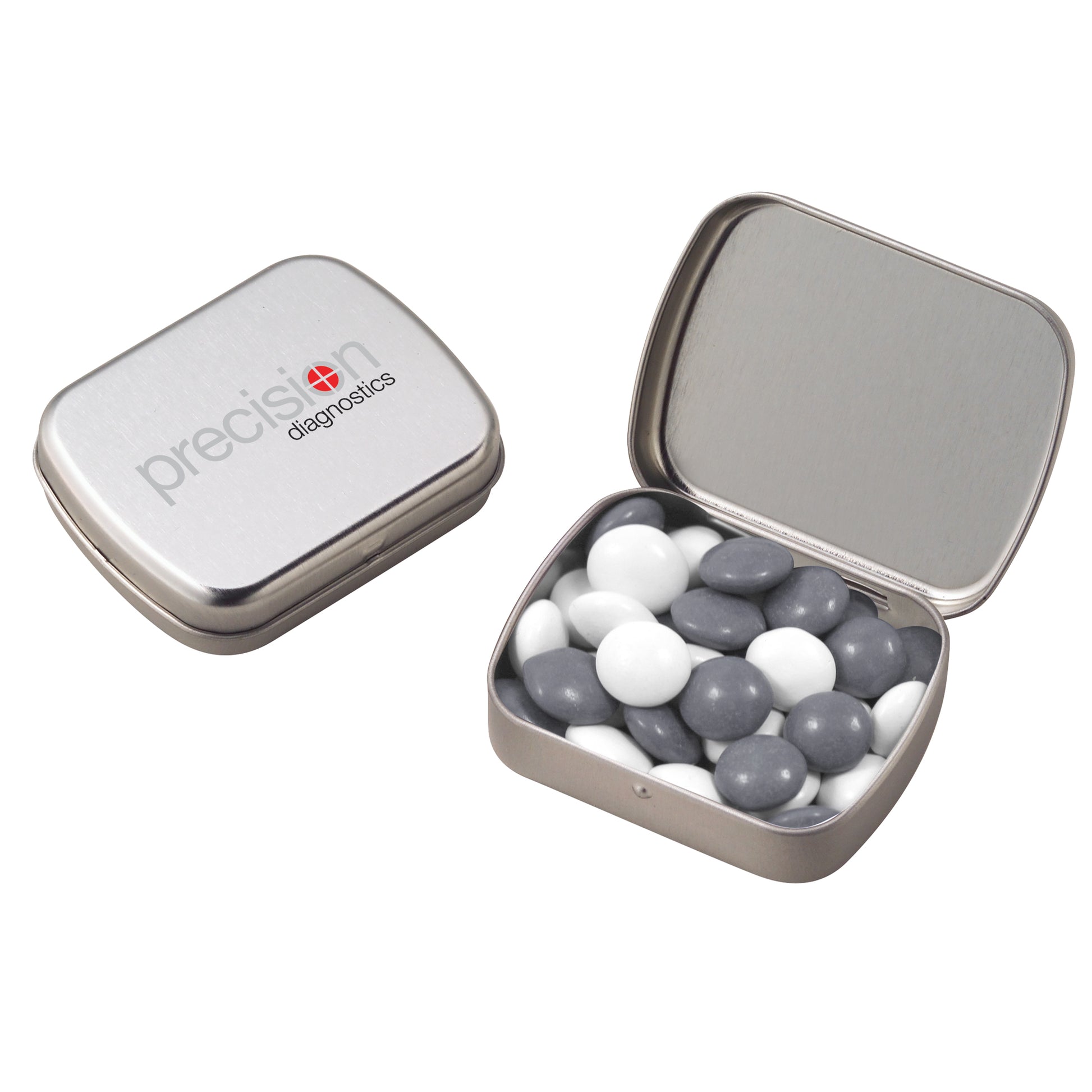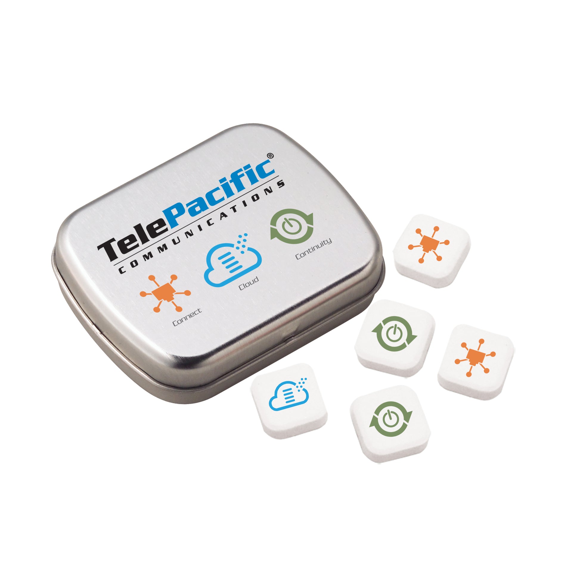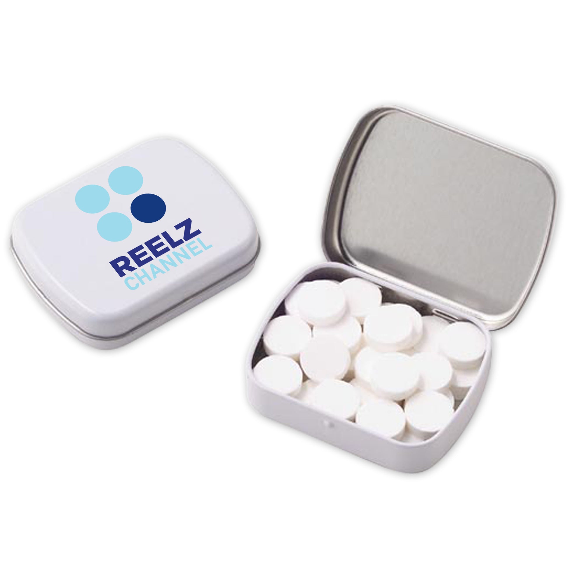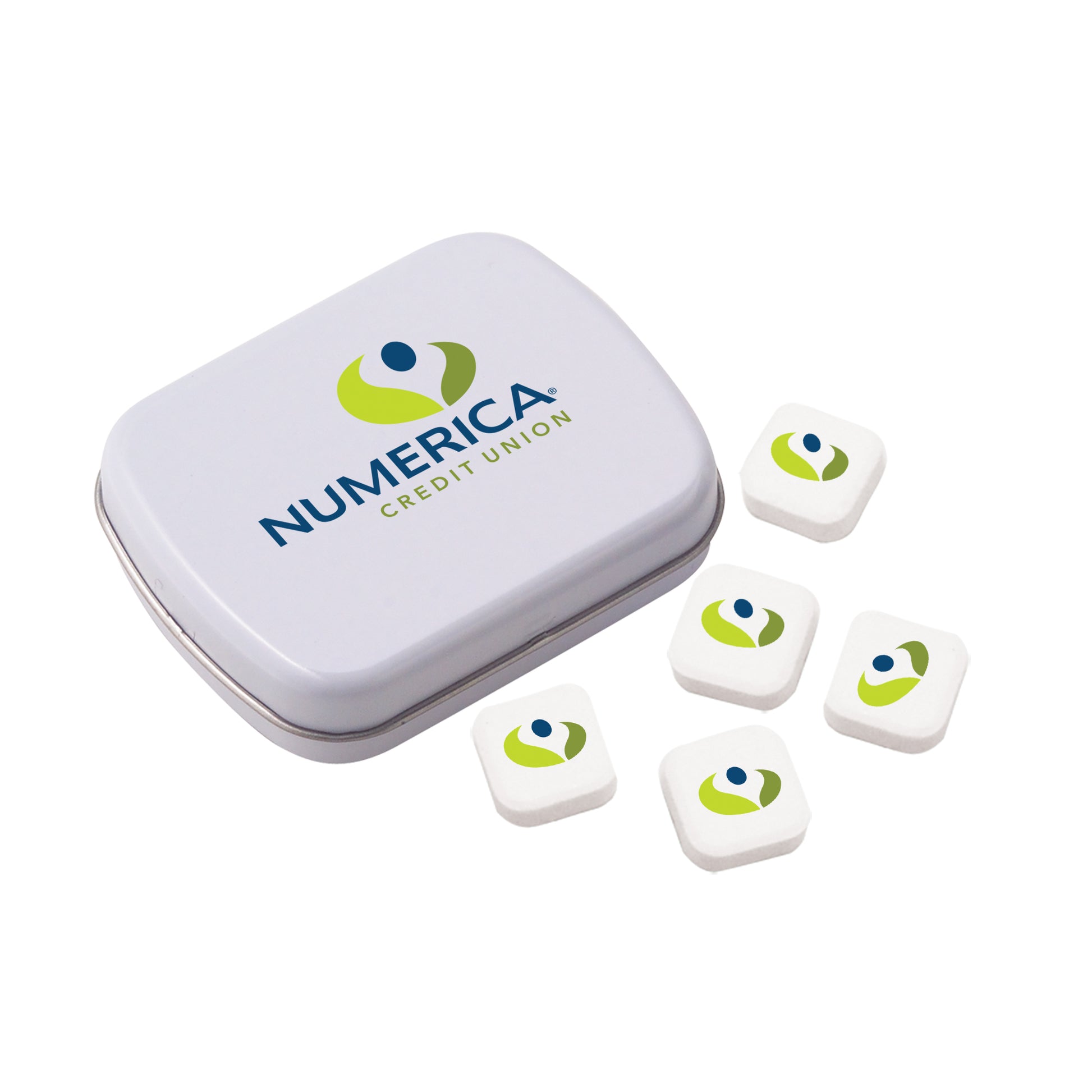 OUR MINTS ARE MADE IN THE USA. Our custom-branded hinged tins are filled with refreshing mints and candies that can be enjoyed throughout the day. The compact size ensures it fits comfortably in pockets, bags, or desks. Your customers will reach for it multiple times a day, ensuring your brand is seen and remembered again and again.