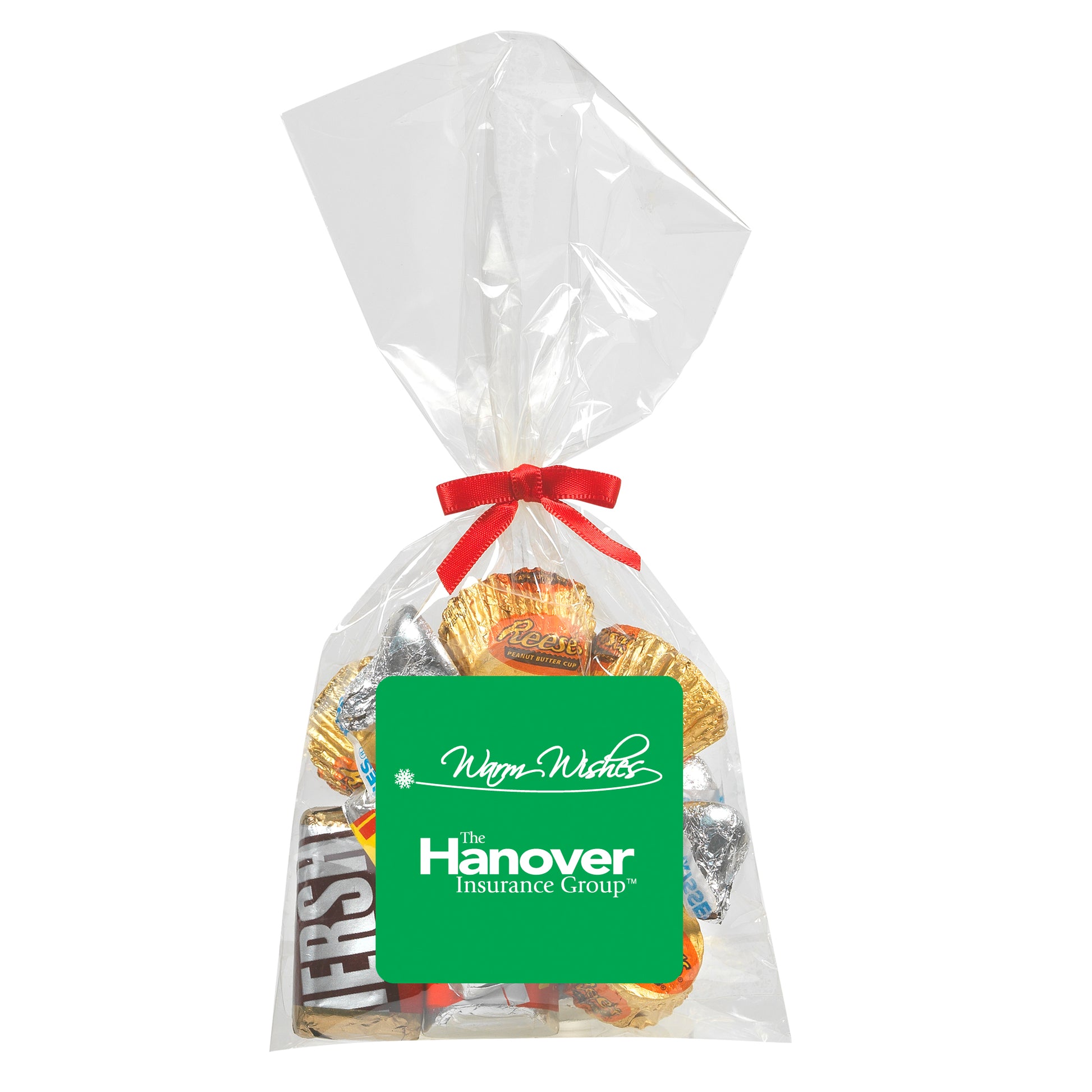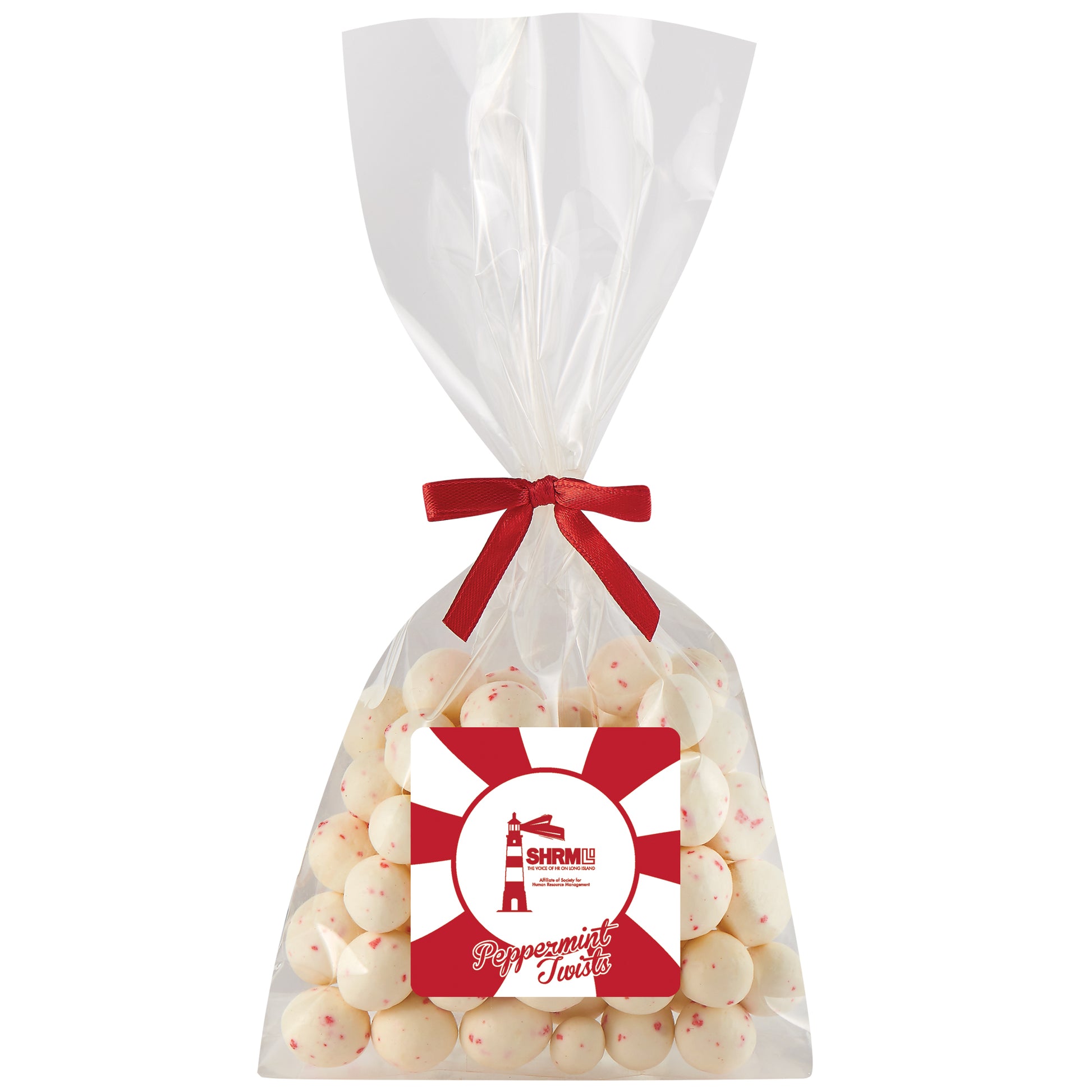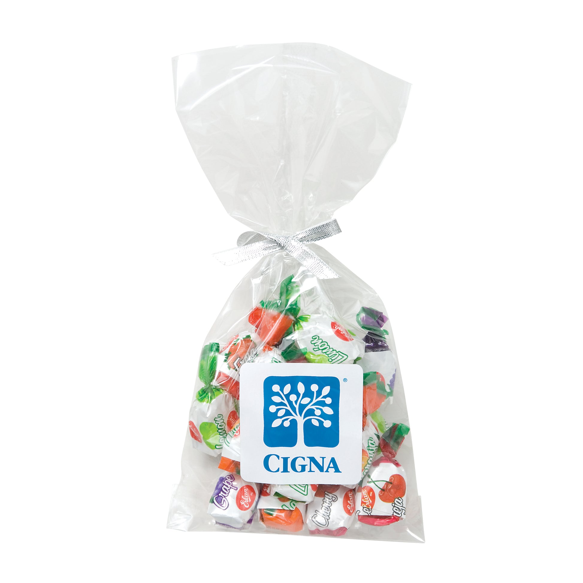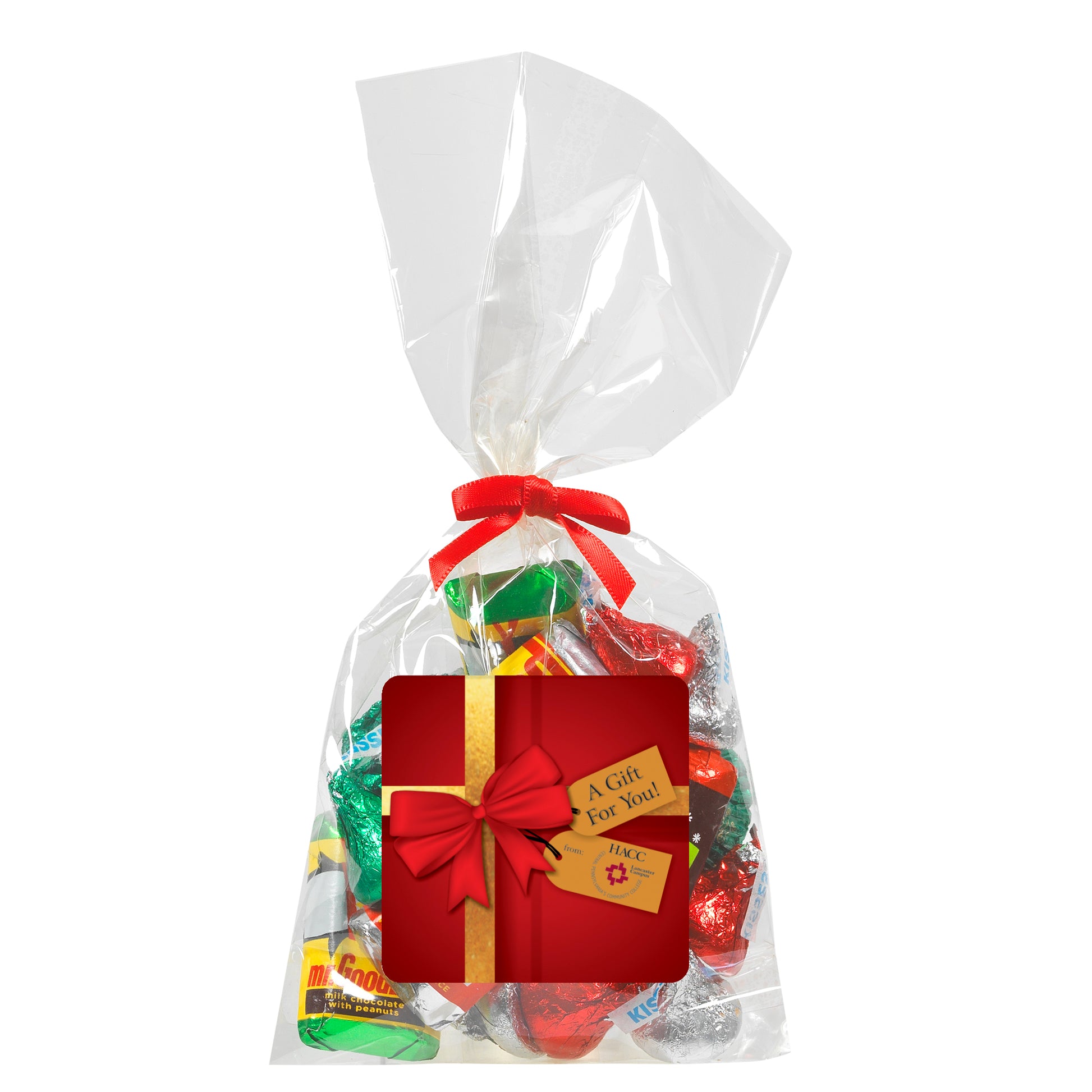 The perfect party favor or office giveaway! These clear bags are closed with your choice of silver, gold, or red twist ties. (Mug not included).