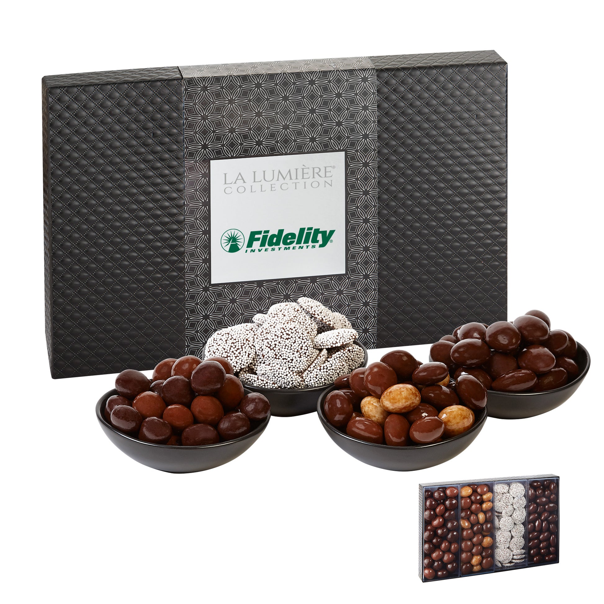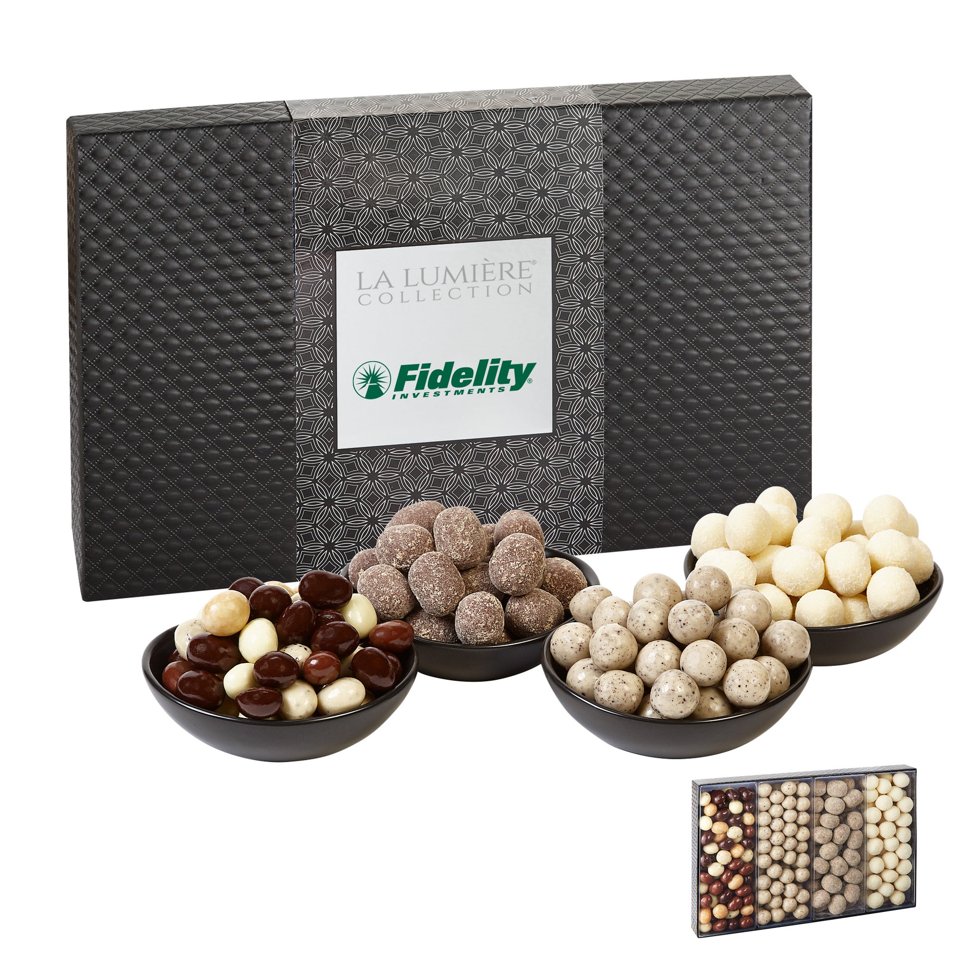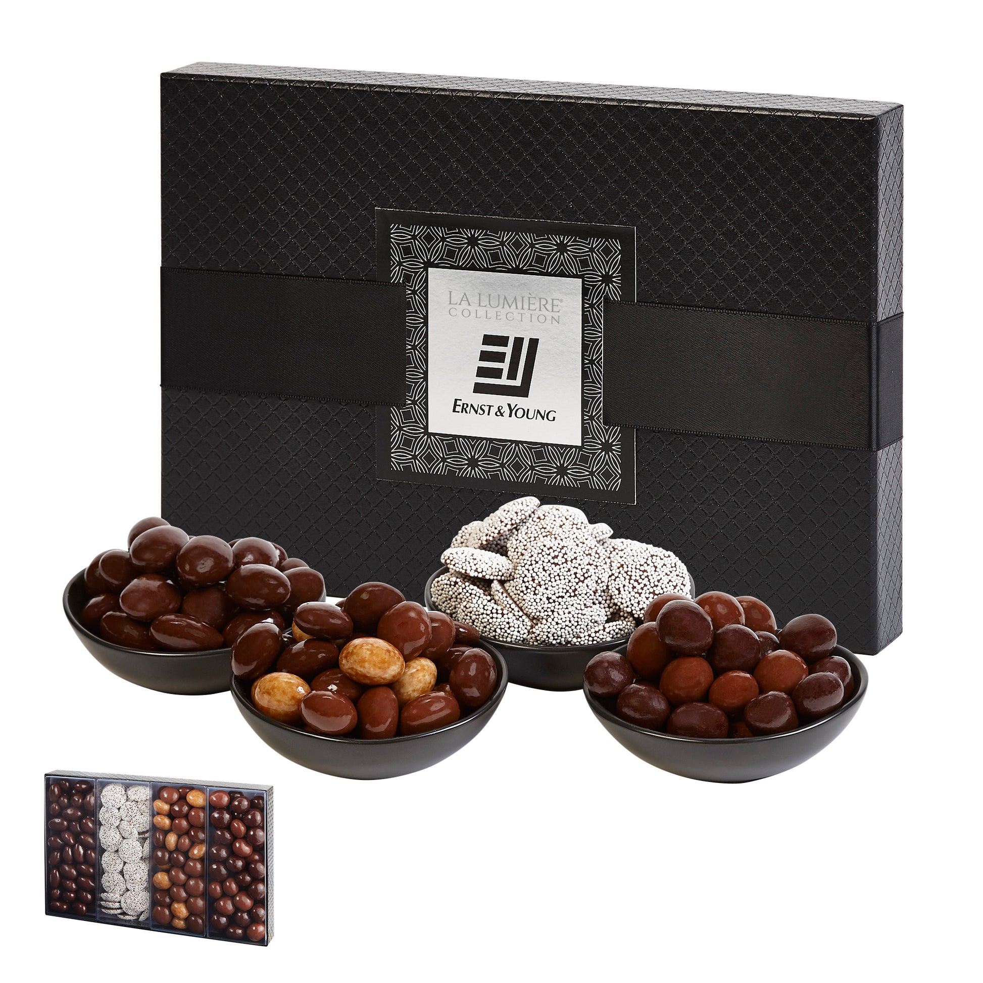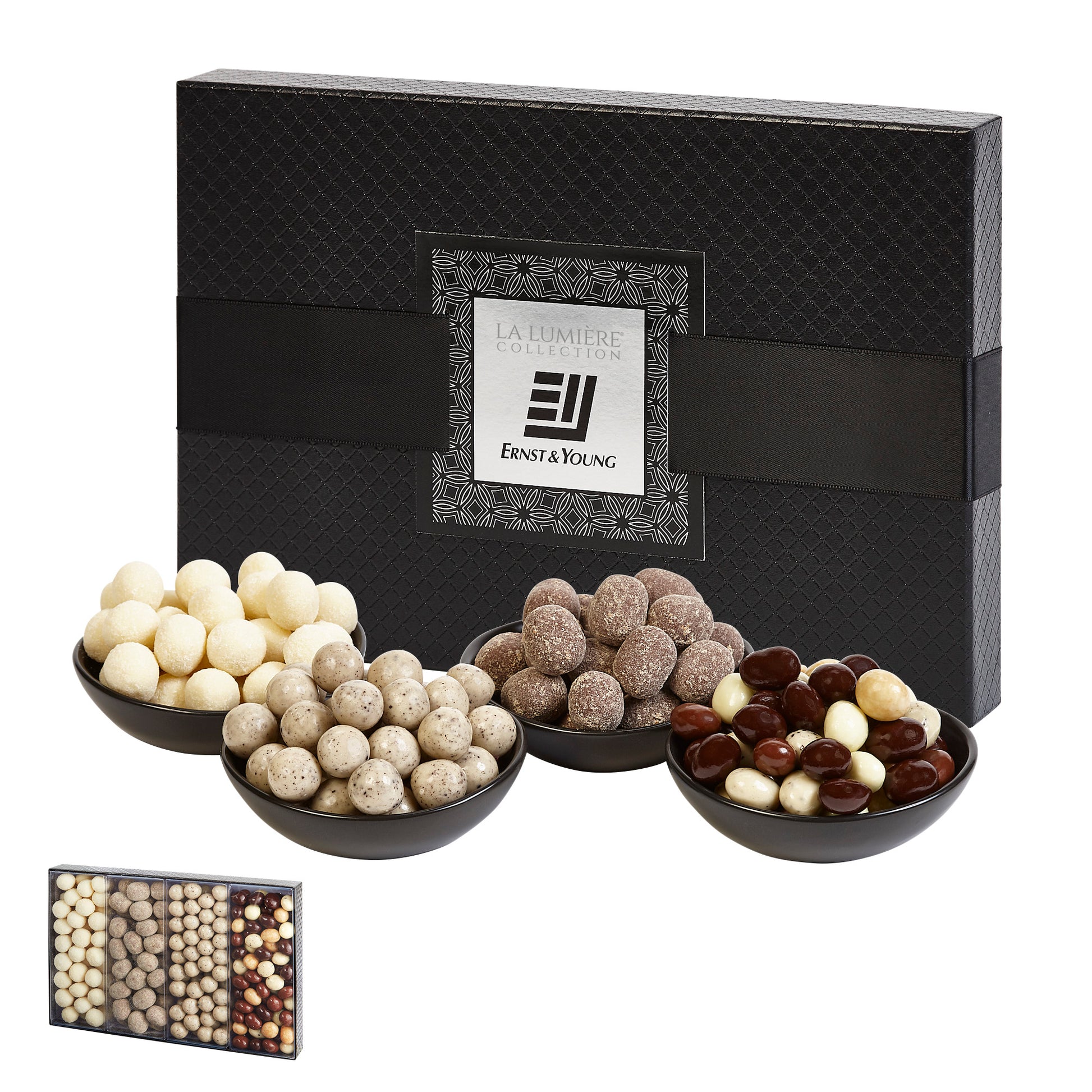 The La Lumiere Collection pairs gourmet chocolates and candies with luxurious metallic paper packaging and soft-touch finishes, creating an elevated gifting experience that exudes elegance and sophistication. Our De Lux Combos features combinations of 4 decadent fillings. Choose between a full sleeve design or a buckle-style tag with satin ribbon to create a stunning gift that’s as sophisticated as it is delicious—perfect for corporate gifting, client appreciation, or any special occasion.
