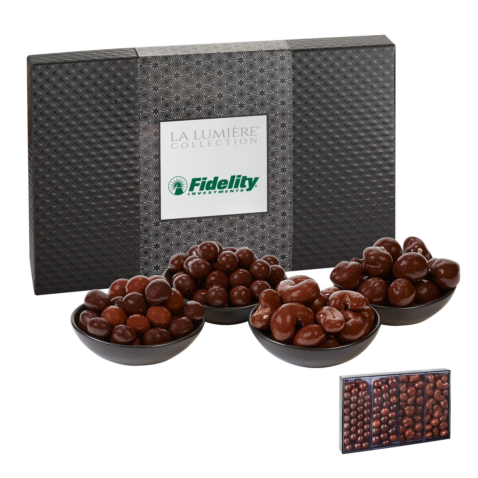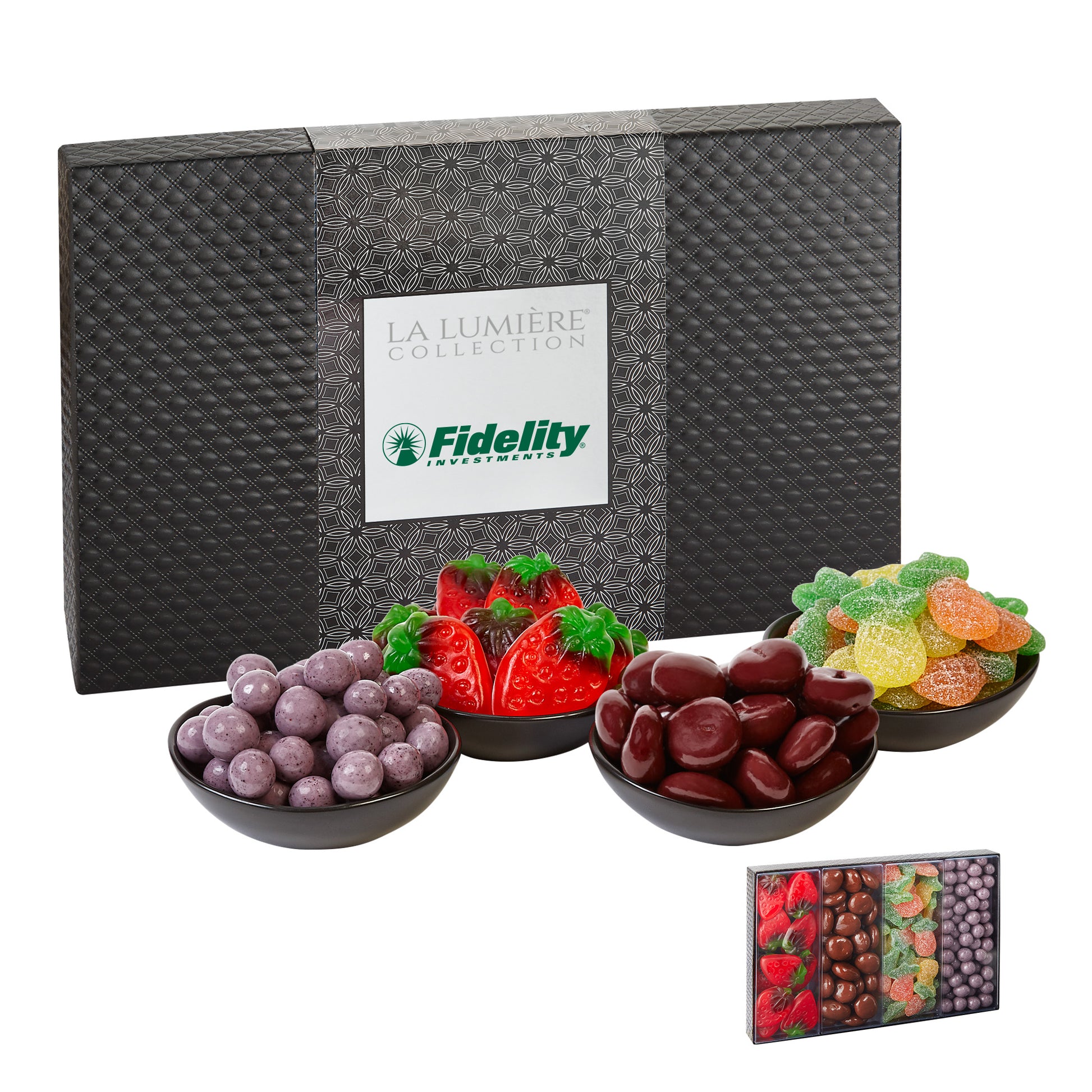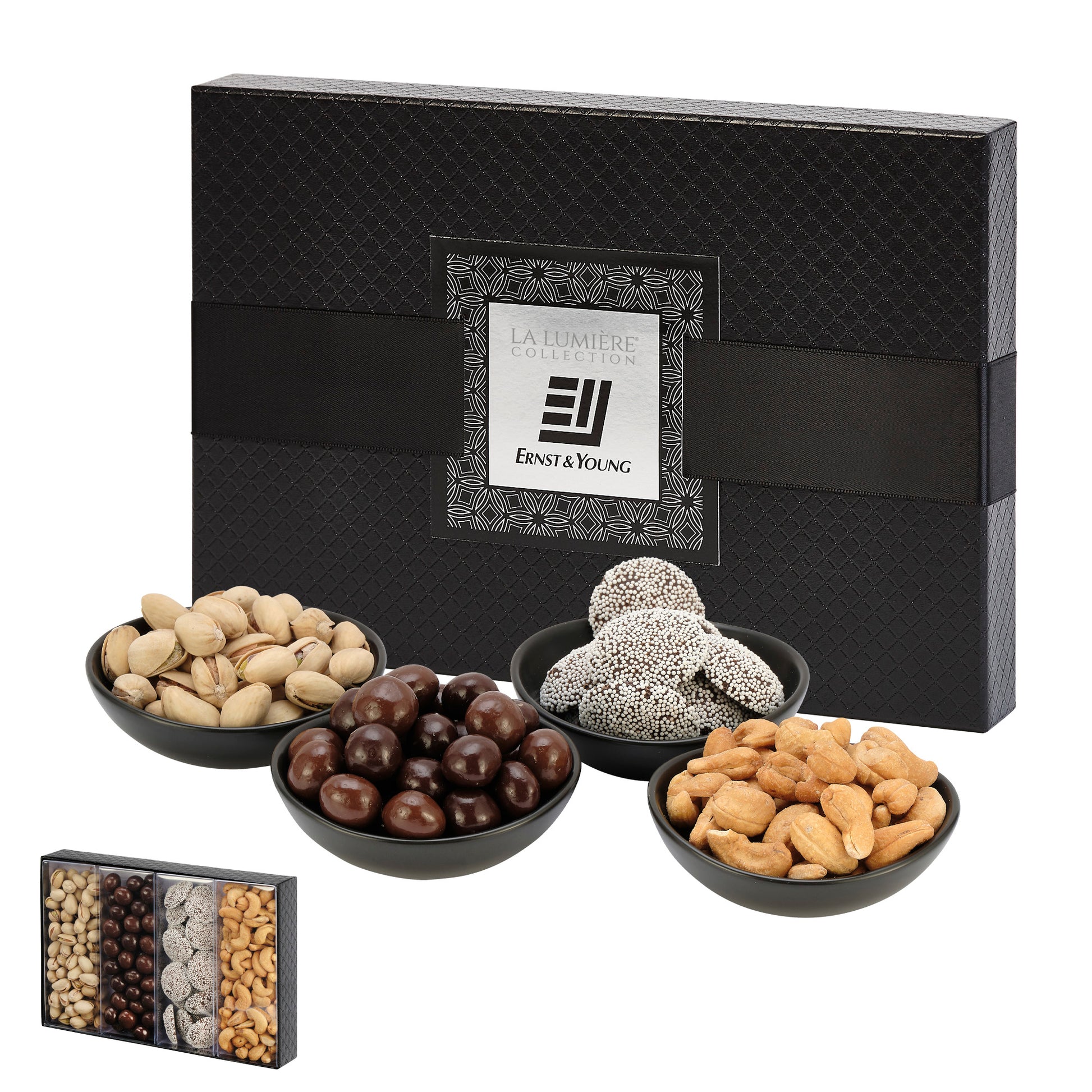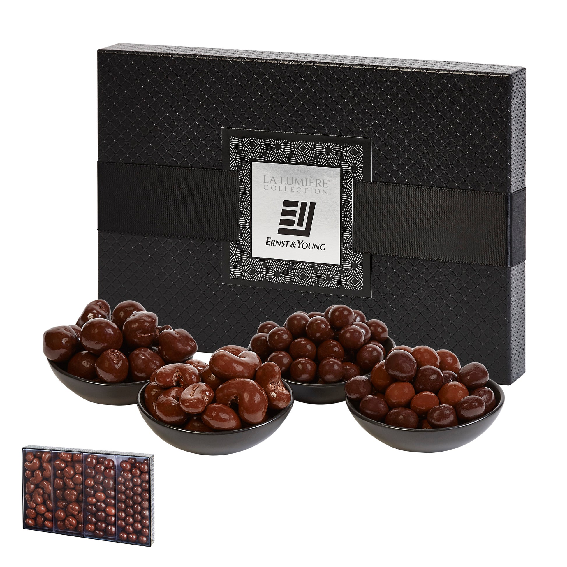 The La Lumiere Collection pairs gourmet chocolates and candies with luxurious metallic paper packaging and soft-touch finishes, creating an elevated gifting experience that exudes elegance and sophistication. Our De Lux Combos features combinations of 4 decadent fillings. Choose between a full sleeve design or a buckle-style tag with satin ribbon to create a stunning gift that’s as sophisticated as it is delicious—perfect for corporate gifting, client appreciation, or any special occasion.