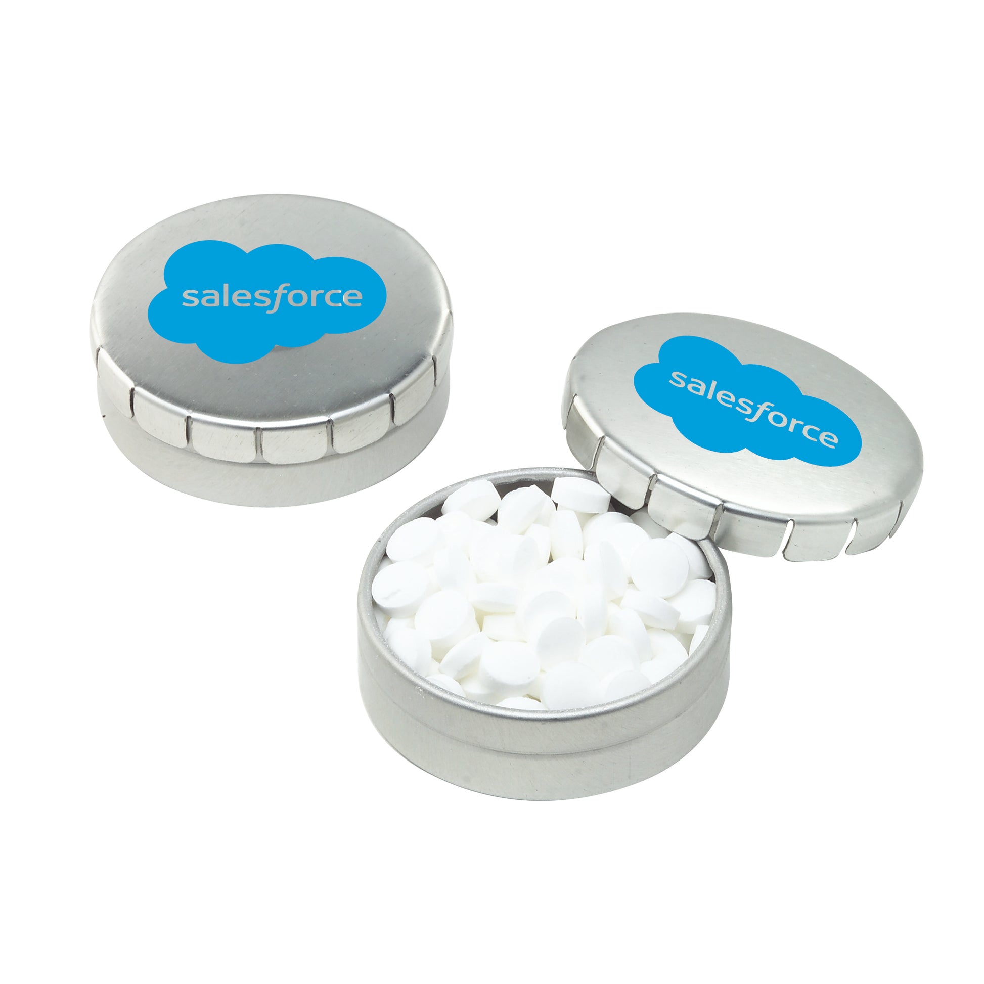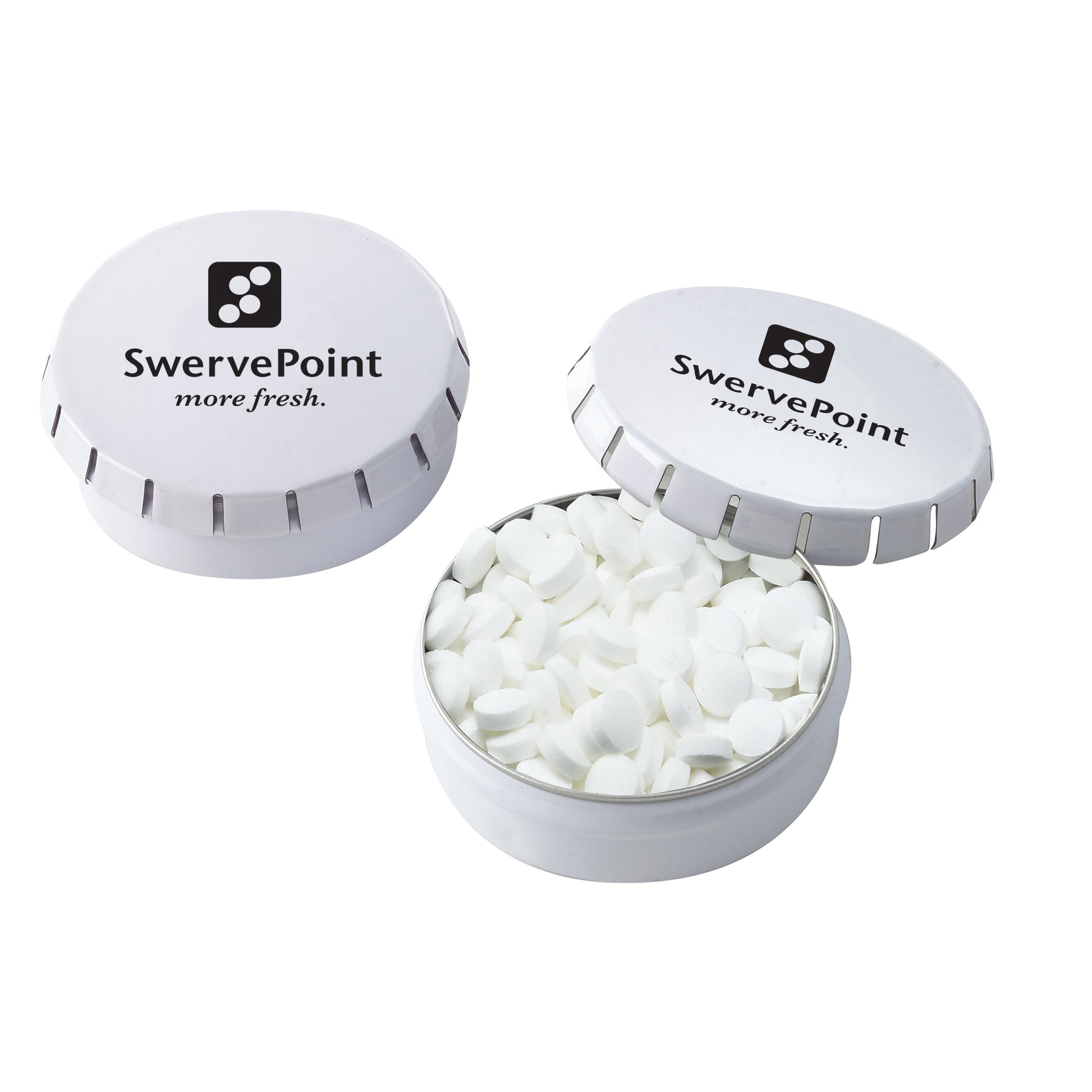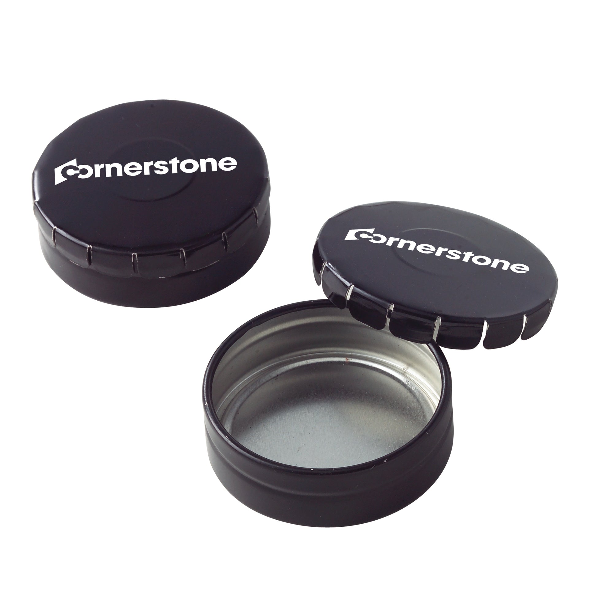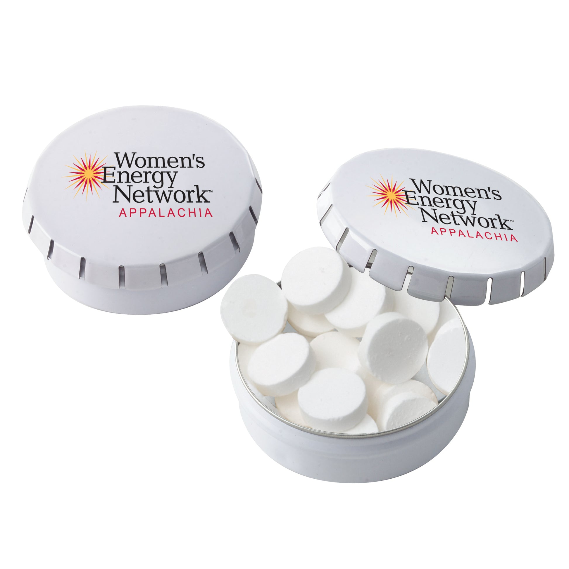 OUR MINTS ARE MADE IN THE USA. Our custom-branded push top tins are filled with refreshing mints and candies that can be enjoyed throughout the day. The compact size ensures it fits comfortably in pockets, bags, or desks. Your customers will reach for it multiple times a day, ensuring your brand is seen and remembered again and again. This unique tin makes a popping noise when opened or closed.