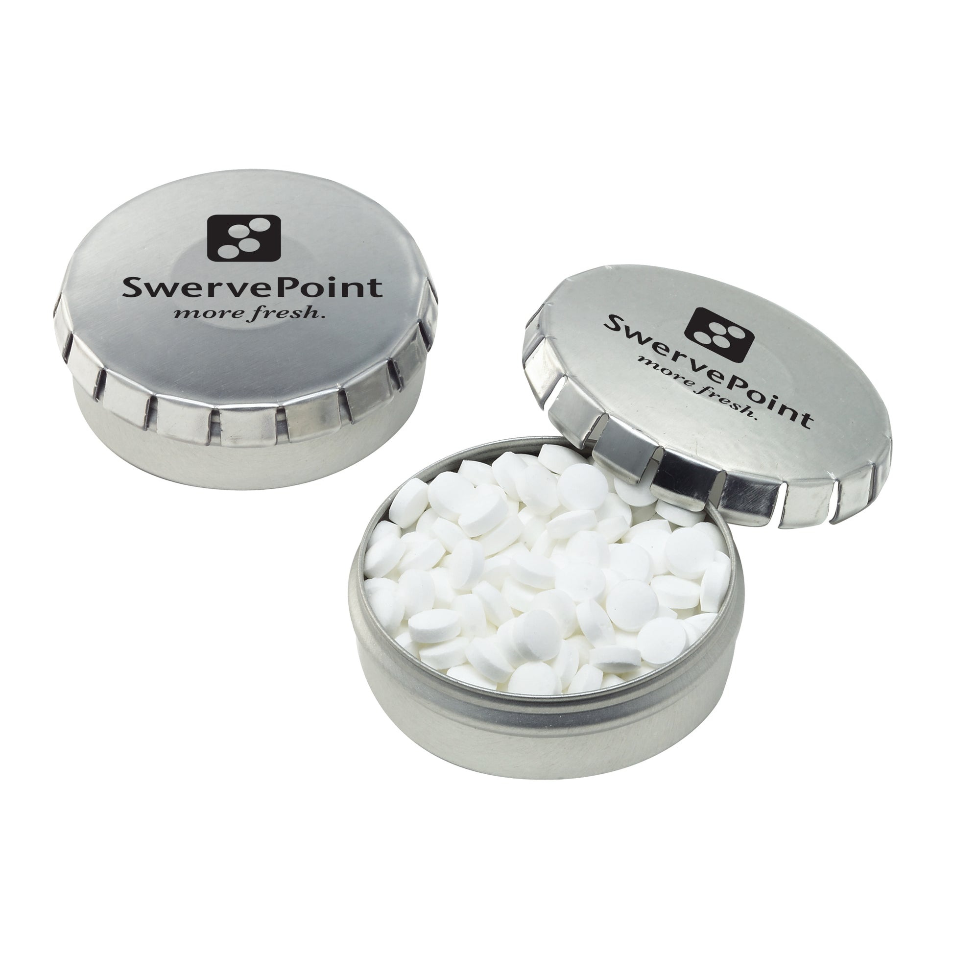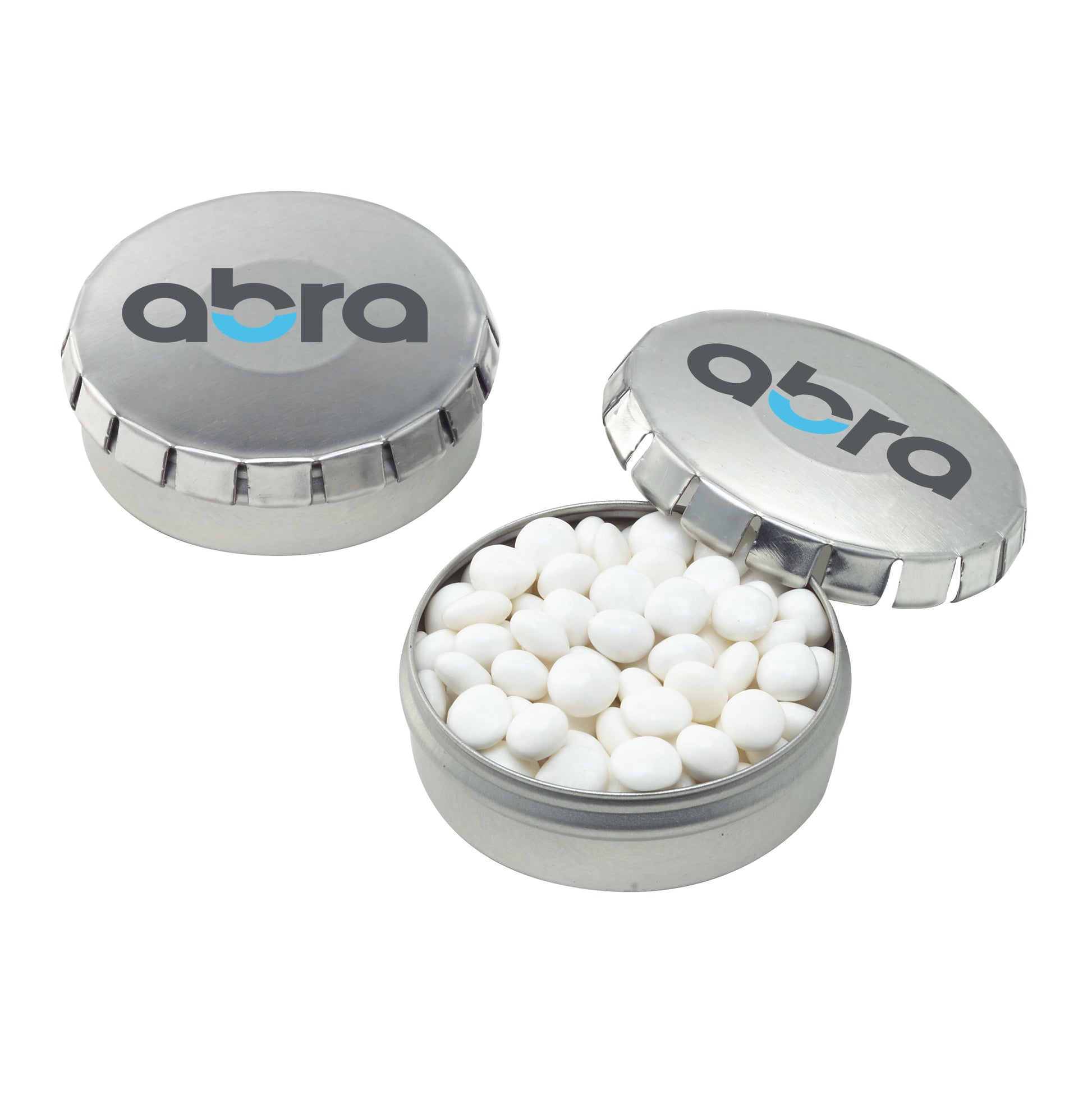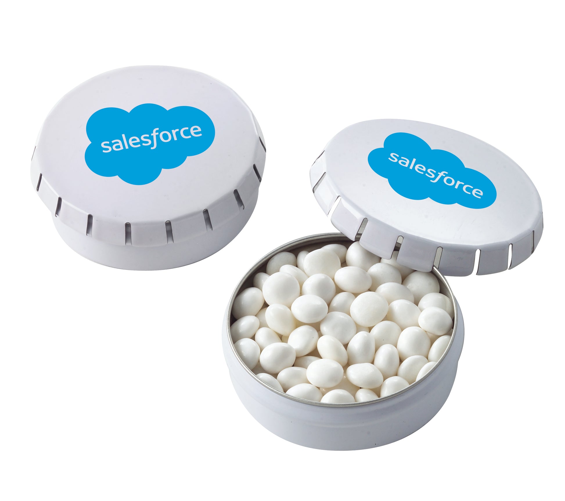 OUR MINTS ARE MADE IN THE USA. Our custom-branded push top tins are filled with refreshing mints and candies that can be enjoyed throughout the day. The compact size ensures it fits comfortably in pockets, bags, or desks. Your customers will reach for it multiple times a day, ensuring your brand is seen and remembered again and again. This unique tin makes a popping noise when opened or closed.