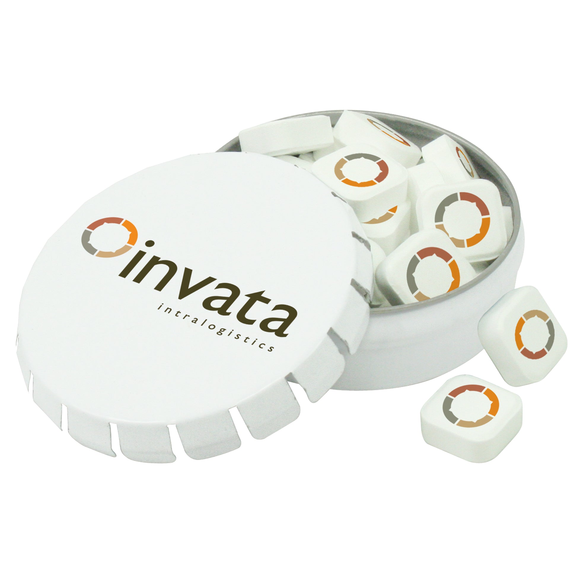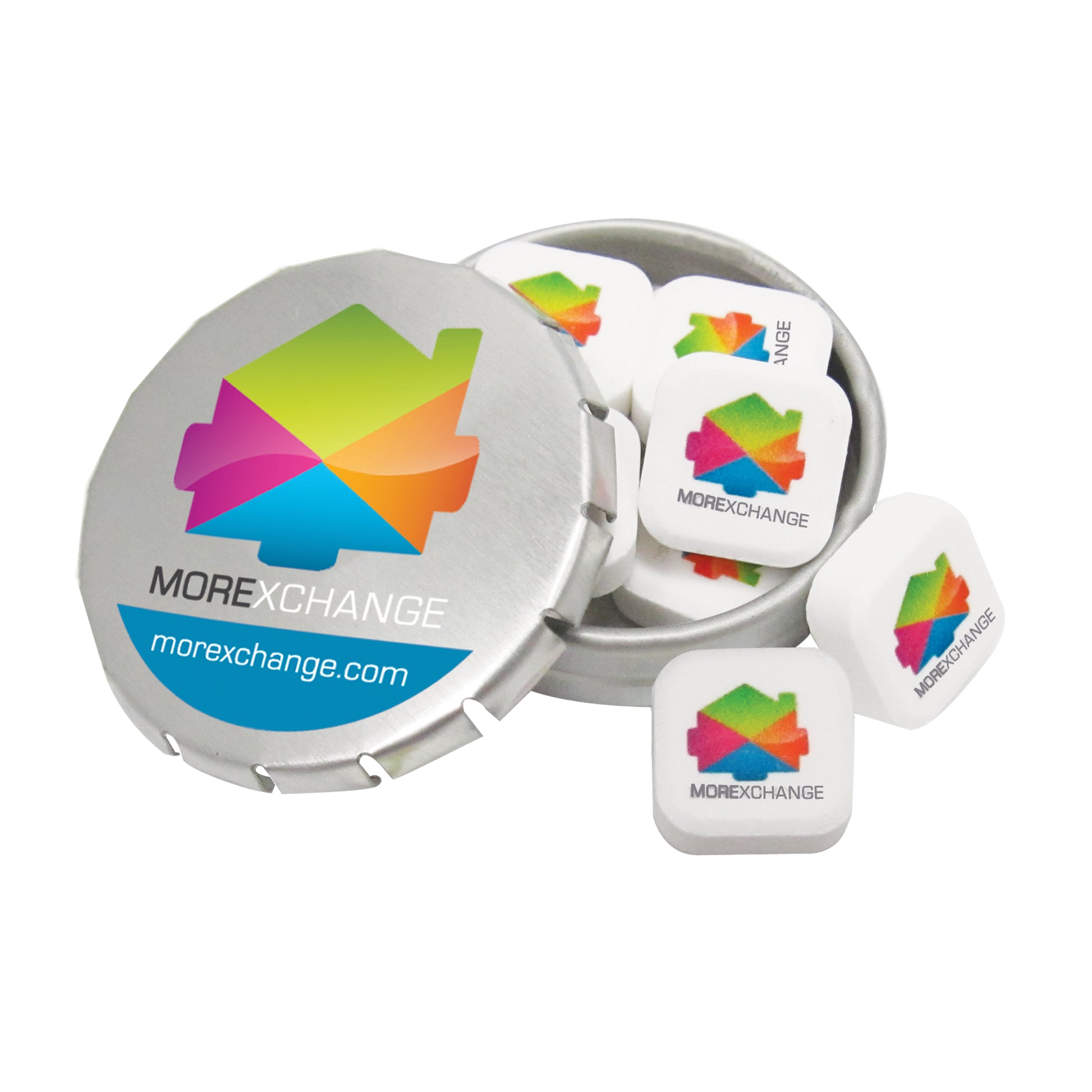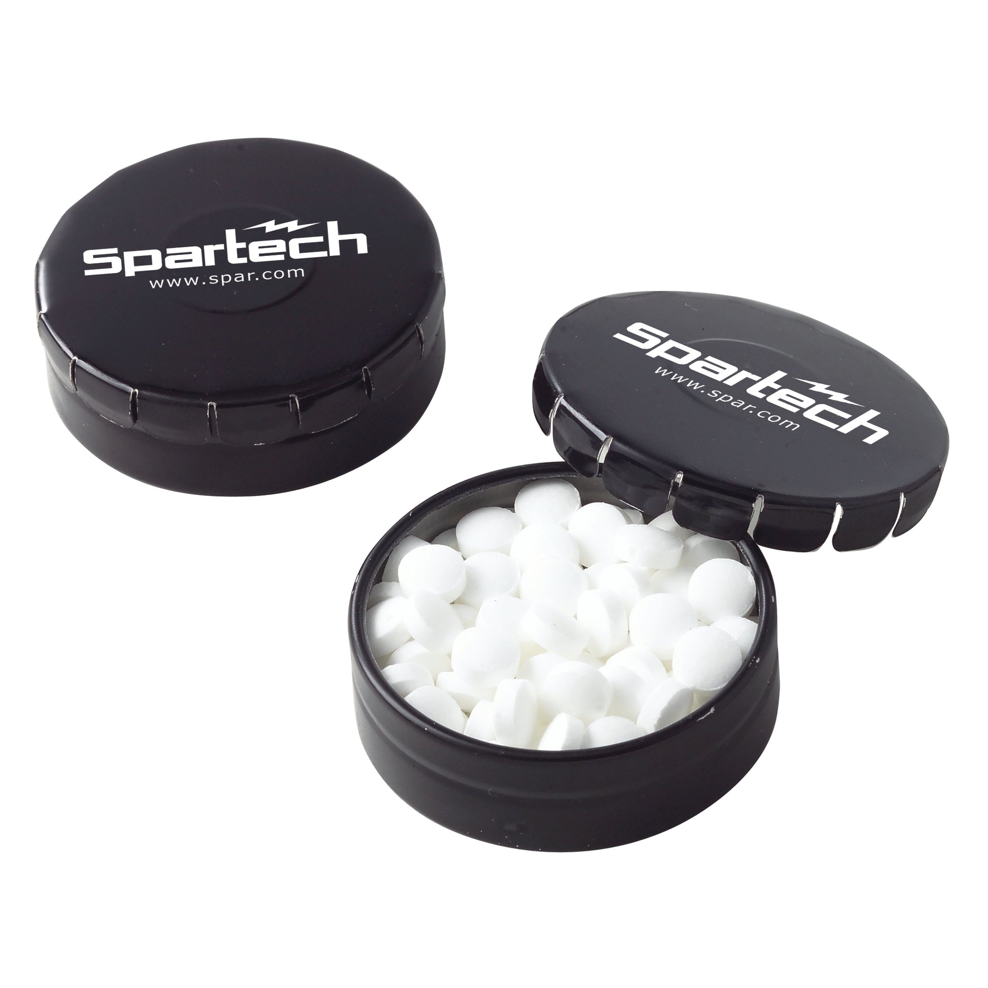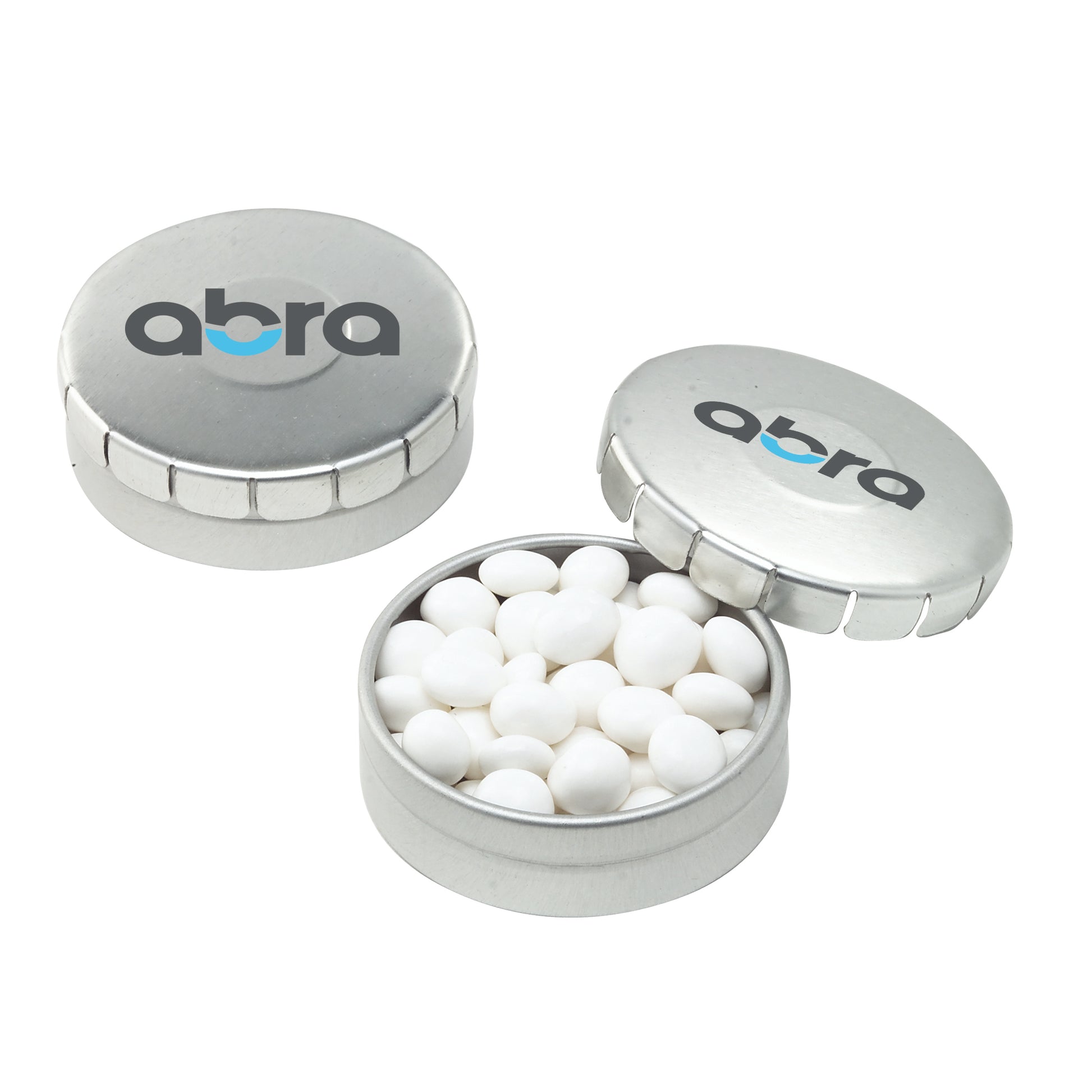 OUR MINTS ARE MADE IN THE USA. Our custom-branded push top tins are filled with refreshing mints and candies that can be enjoyed throughout the day. The compact size ensures it fits comfortably in pockets, bags, or desks. Your customers will reach for it multiple times a day, ensuring your brand is seen and remembered again and again. This unique tin makes a popping noise when opened or closed.