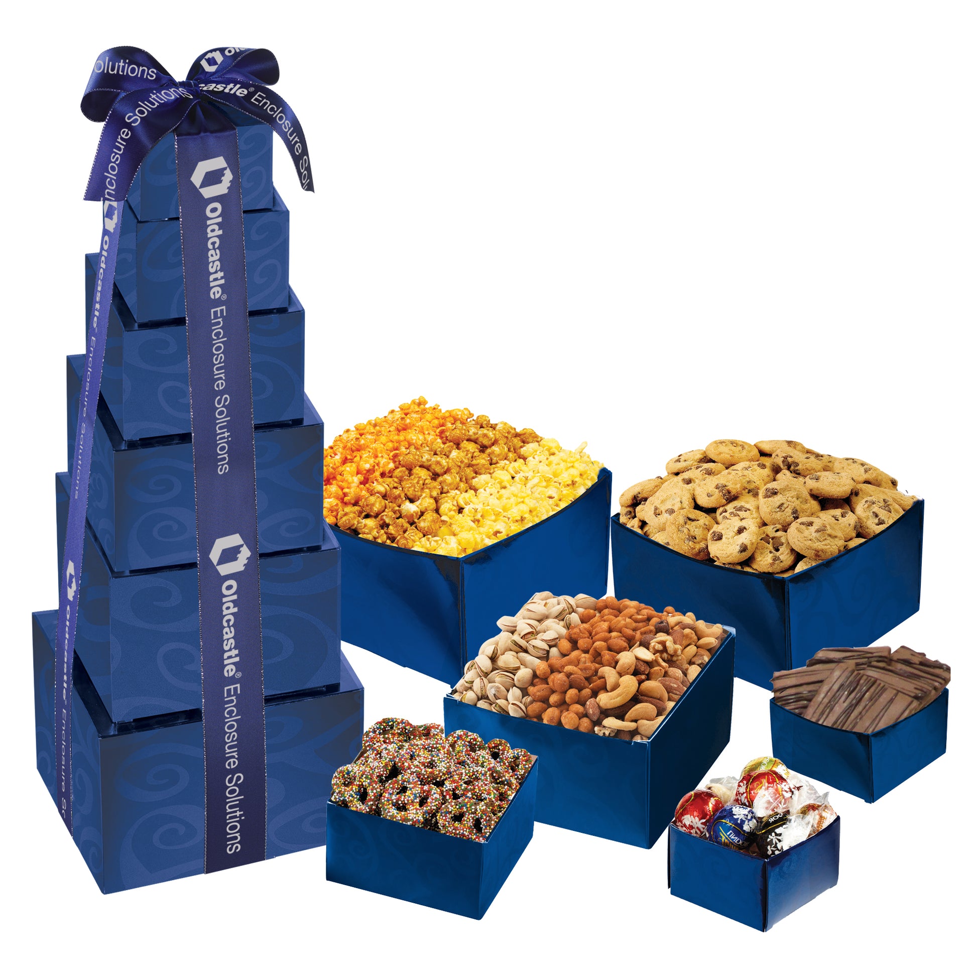 It is time to tower over the competition this holiday season. This tower is filled with our classic Butter, Cheddar and Caramel Popcorn trio, out finest deluxe Mixed Nuts alongside Pistachios and sweet Honey Roasted Peanuts, followed by our most popular Chocolate Chip Mini Cookies, Chocolate Covered Sprinkled Pretzels, smooth Milk Chocolate Covered Graham Crackers drizzled with rich Dark Chocolate topped off with decadent Lindt® Truffles
