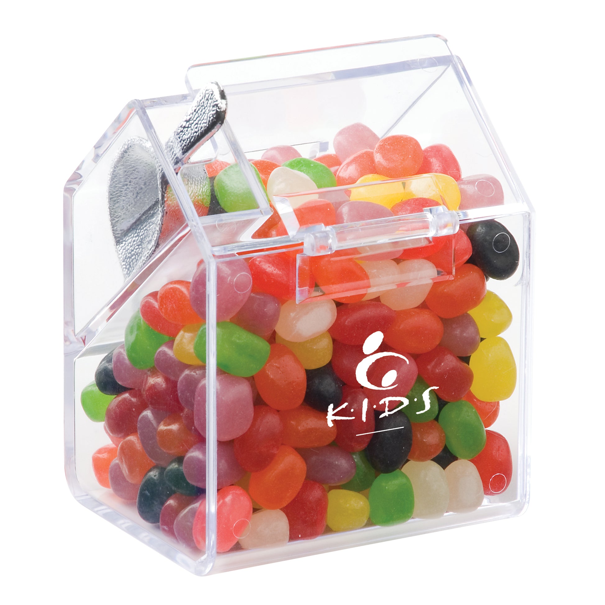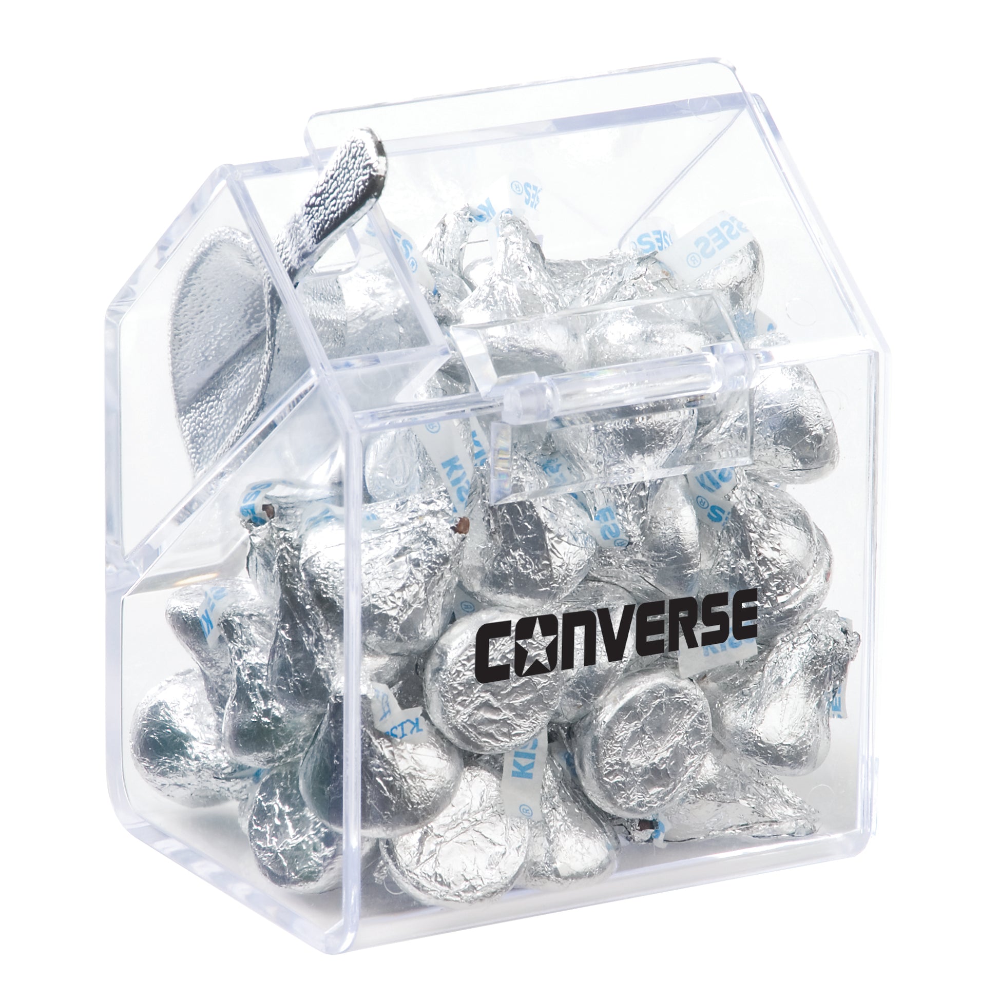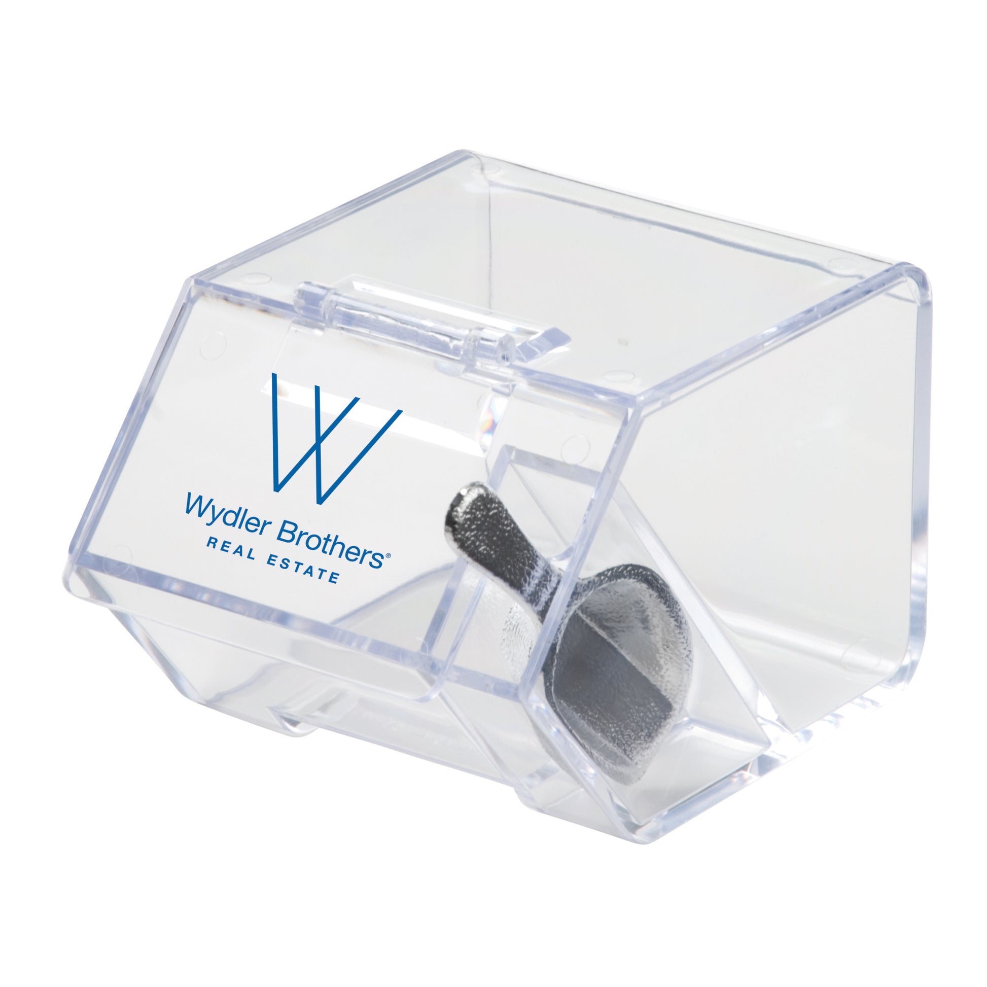 This versatile bin can be used as a house shaped candy container, or turned on its side to be used as a candy shop dispenser. An ideal promotion for real estate, mortgage and insurance companies. (Serving scoop included).