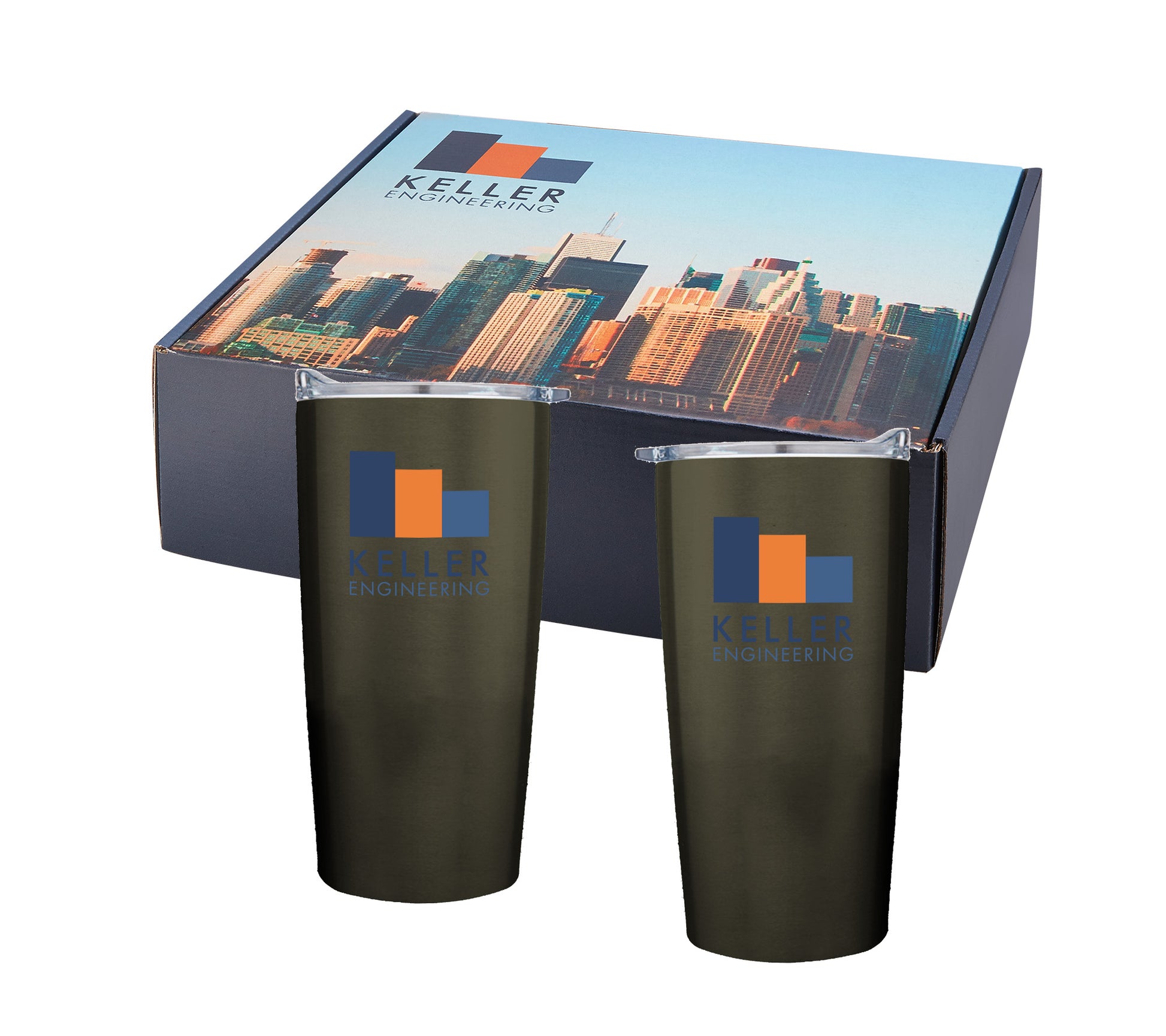 This set of two 20 ounce Vacuum Insulated Stainless Steel Tumblers combined with one of our vibrant, full color brand boosting boxes turns a simple drinkware piece into a gift worth giving! The drinkware is nestled securely in a custom cut insert, creating an impressive presentation! The boxes are shipping-grade mailers, making drop shipping easy and affordable!