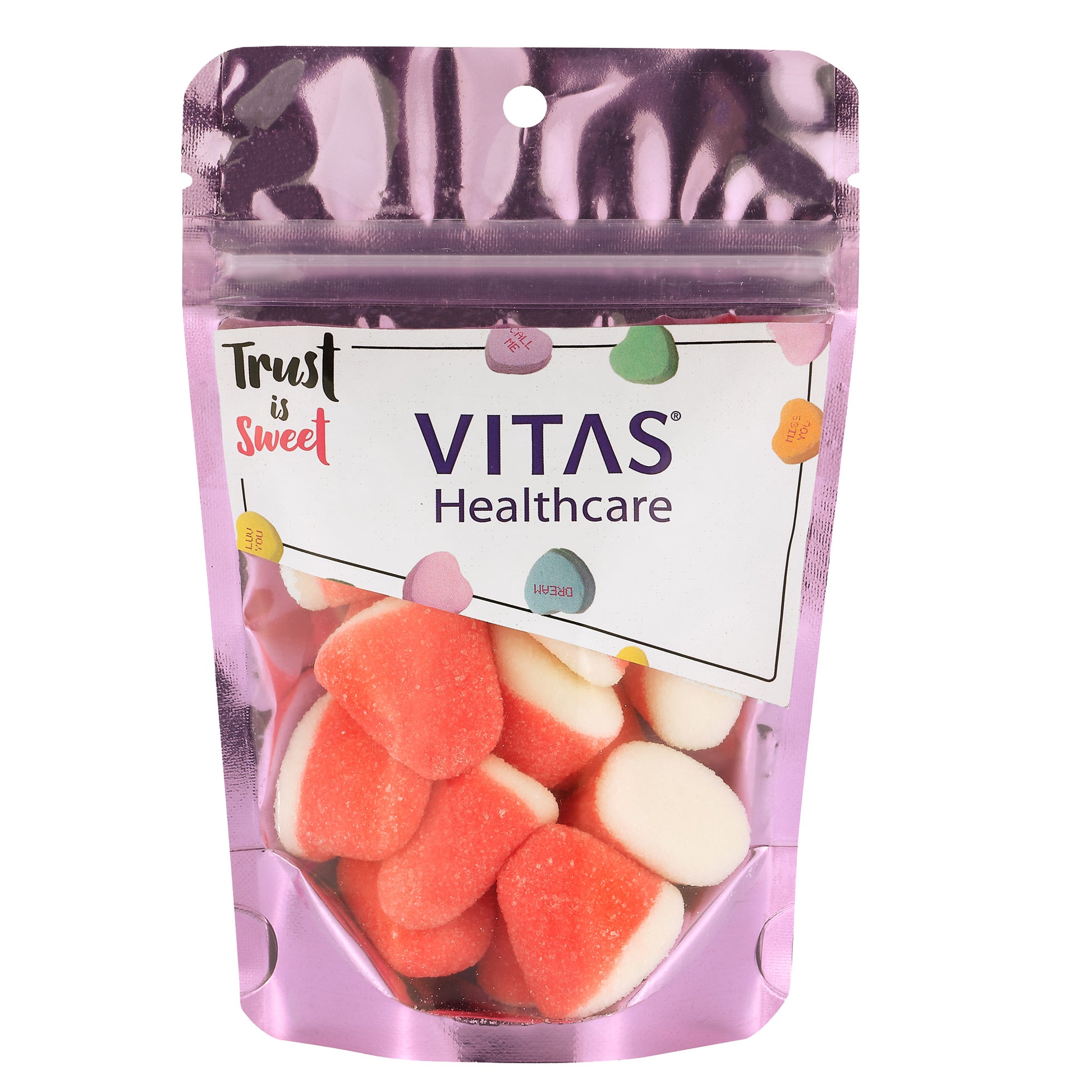 Some for now, some for later! Our new metallic, zipper pouches are resealable, making leftover candy (if there is any) easy to store for later. Choose from 5 of our most loved valentine's day fills! A custom, angled label is applied to the front of the bag. Add a logo to any of our stock designs shown, or create your own artwork.