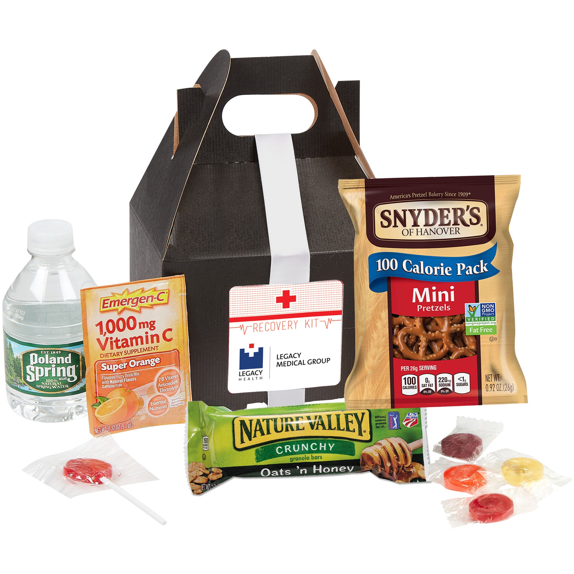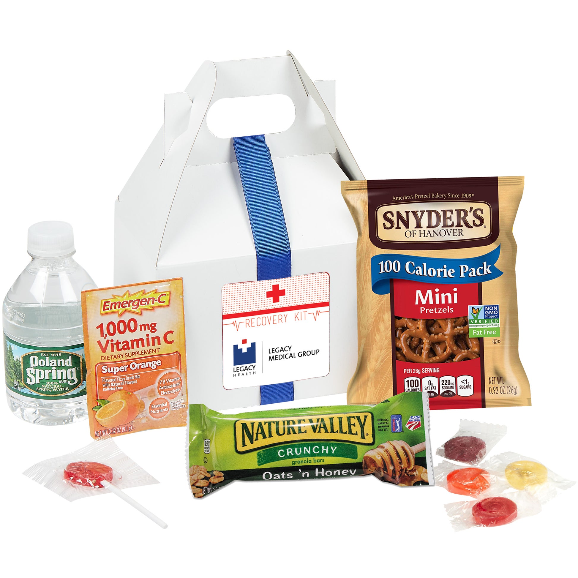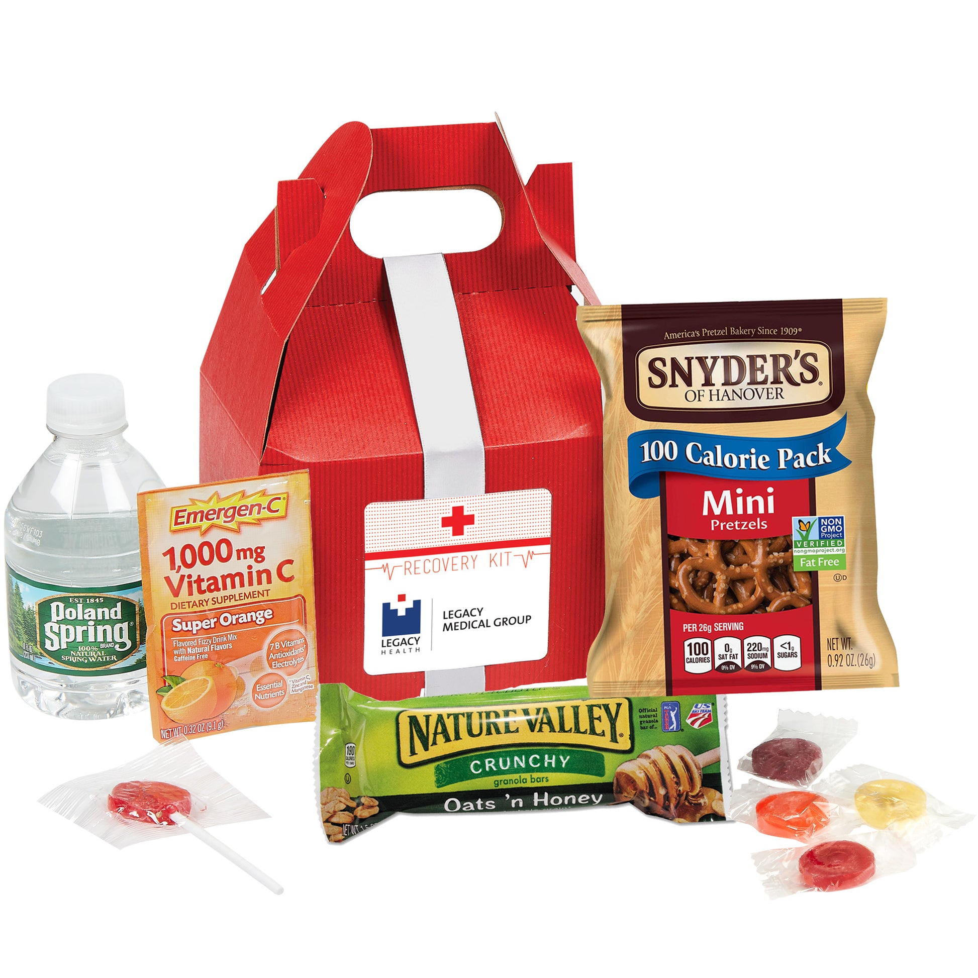 Recovery Kit includes: Emergen-C® Packet (0.32 oz), Nature's Valley® Granola Bar (1.5 oz), Poland Spring® Water (8 oz), Pretzels (1 oz), Lifesaver® Roll (1 pc), Assorted Lollipop (1 pc)