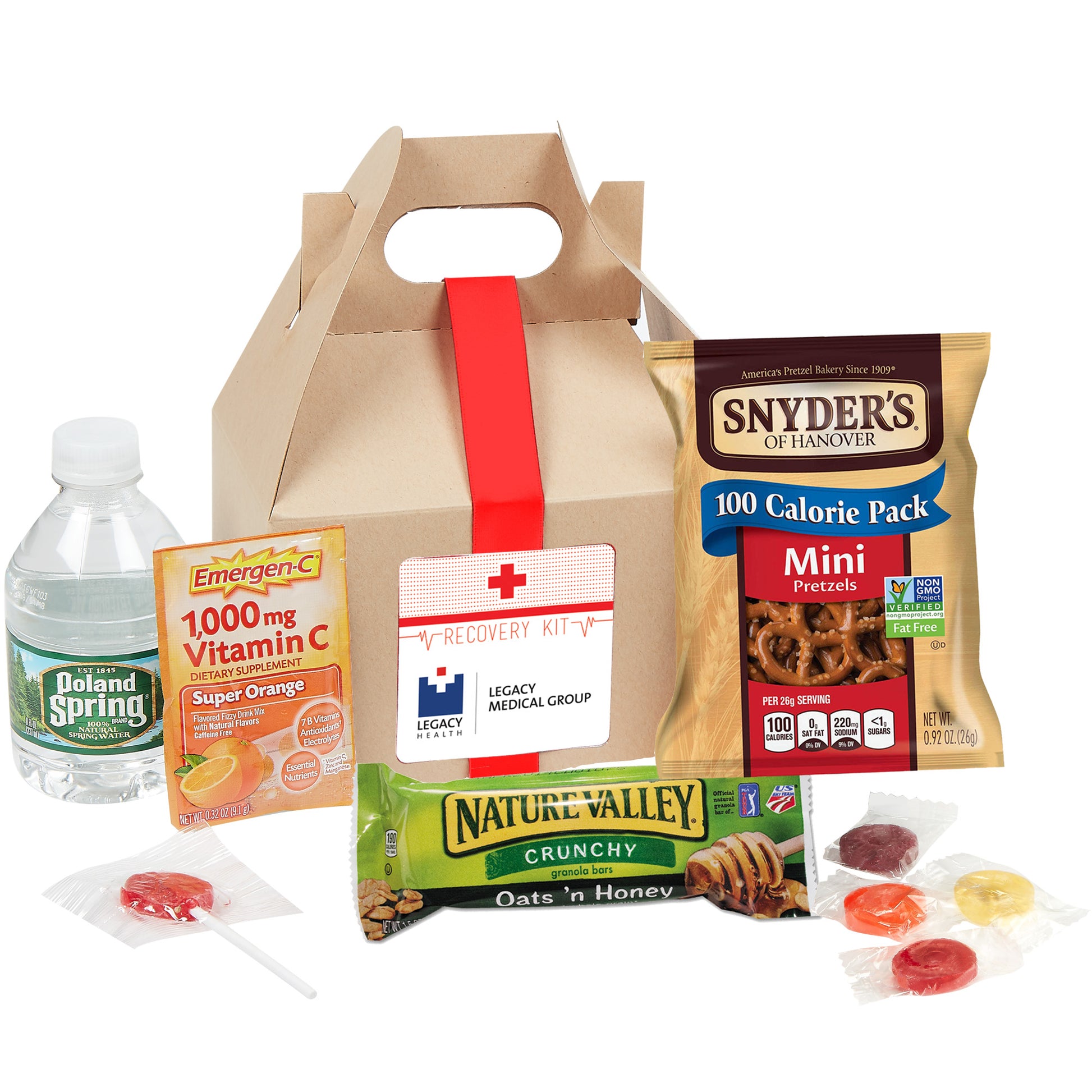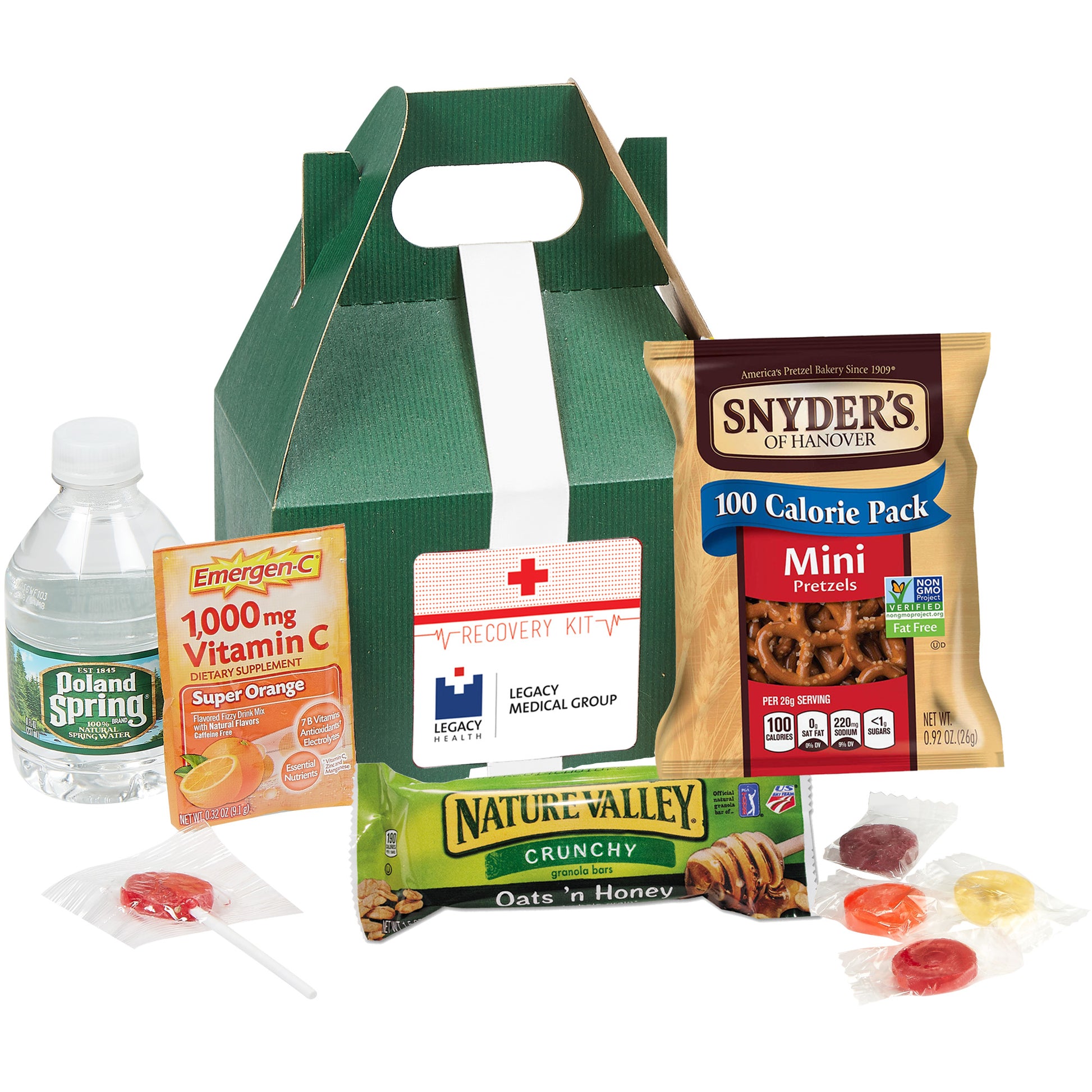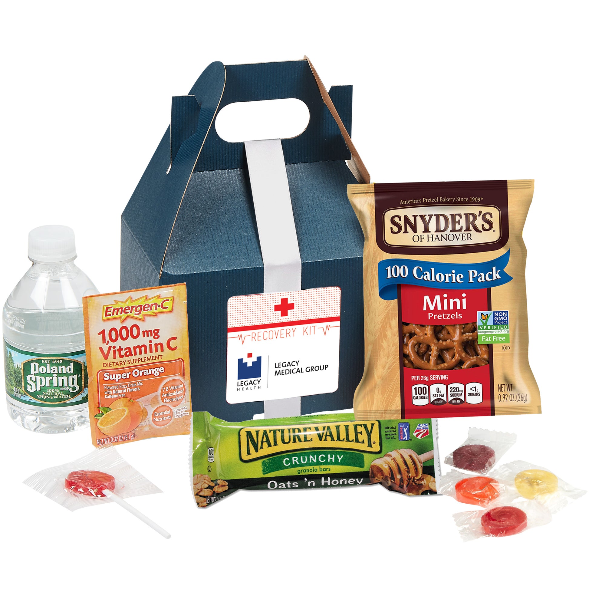 Recovery Kit includes: Emergen-C® Packet (0.32 oz), Nature's Valley® Granola Bar (1.5 oz), Poland Spring® Water (8 oz), Pretzels (1 oz), Lifesaver® Roll (1 pc), Assorted Lollipop (1 pc)